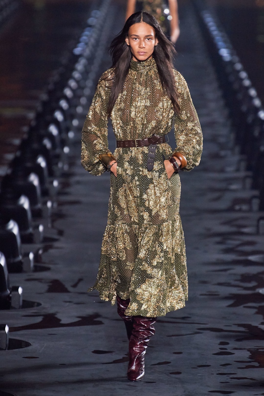 В процессе подготовки к новому шоу дизайнер вновь исследовал архивы Ива Сен-Лорана. Так, на подиуме появились комбинезон с V-образным вырезом, напоминающий тот, что основатель бренда создал в 1968 году, версии знаменитых костюмов Le Smoking, представленные в 1966-м, а также платья с золотой вышивкой, отсылающие к «русской коллекции» 1976-го.