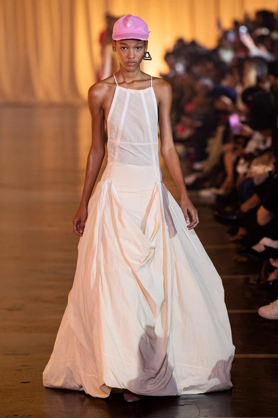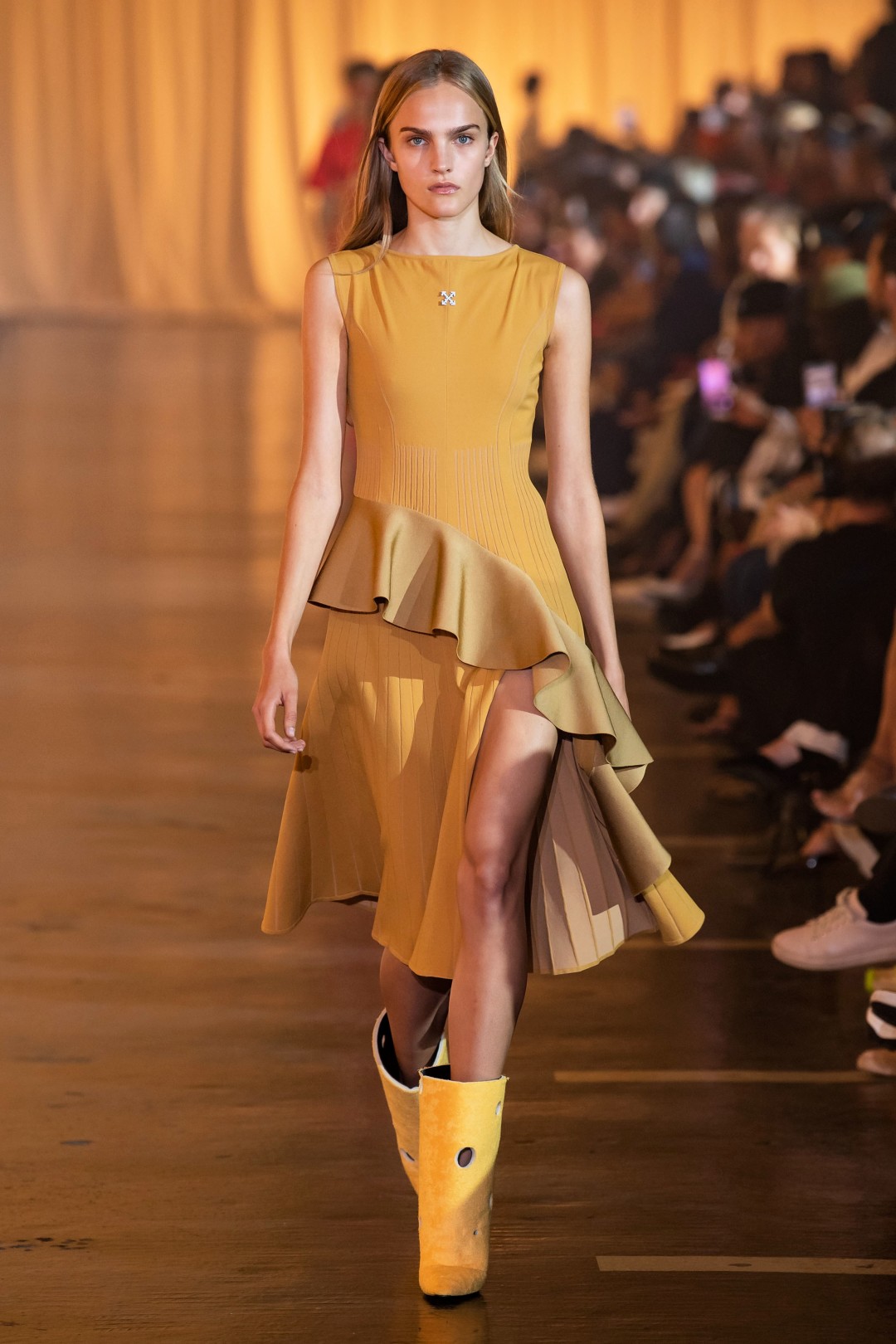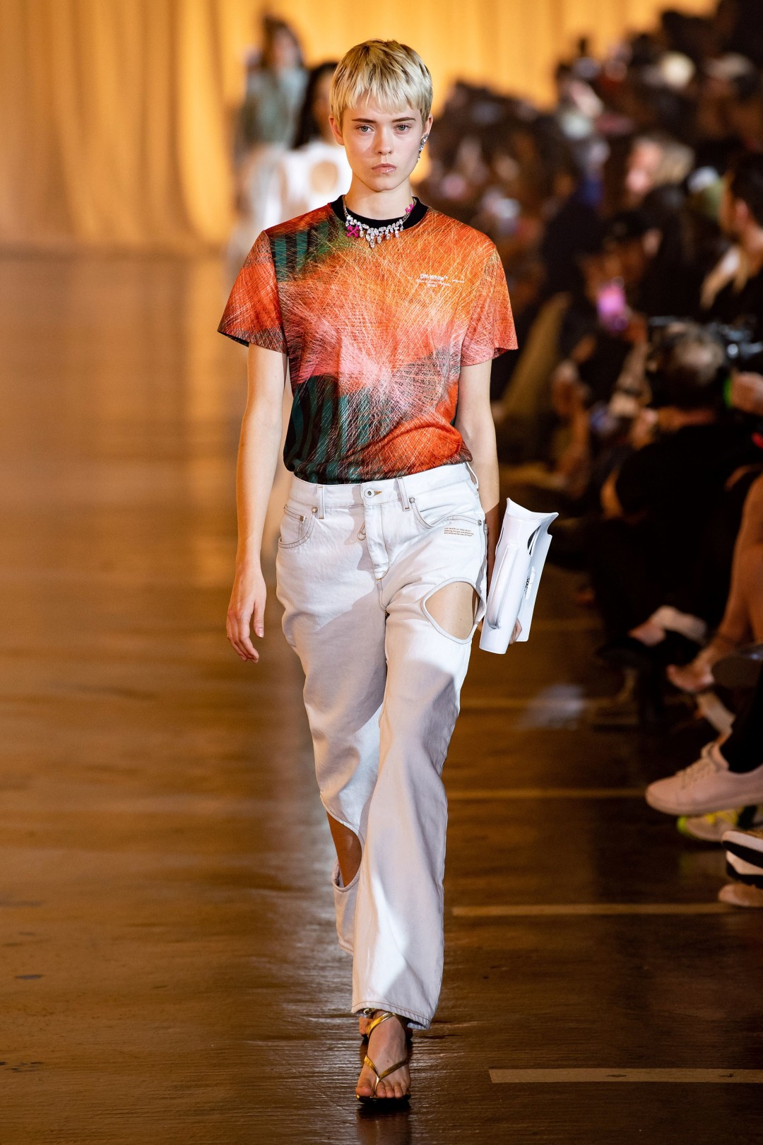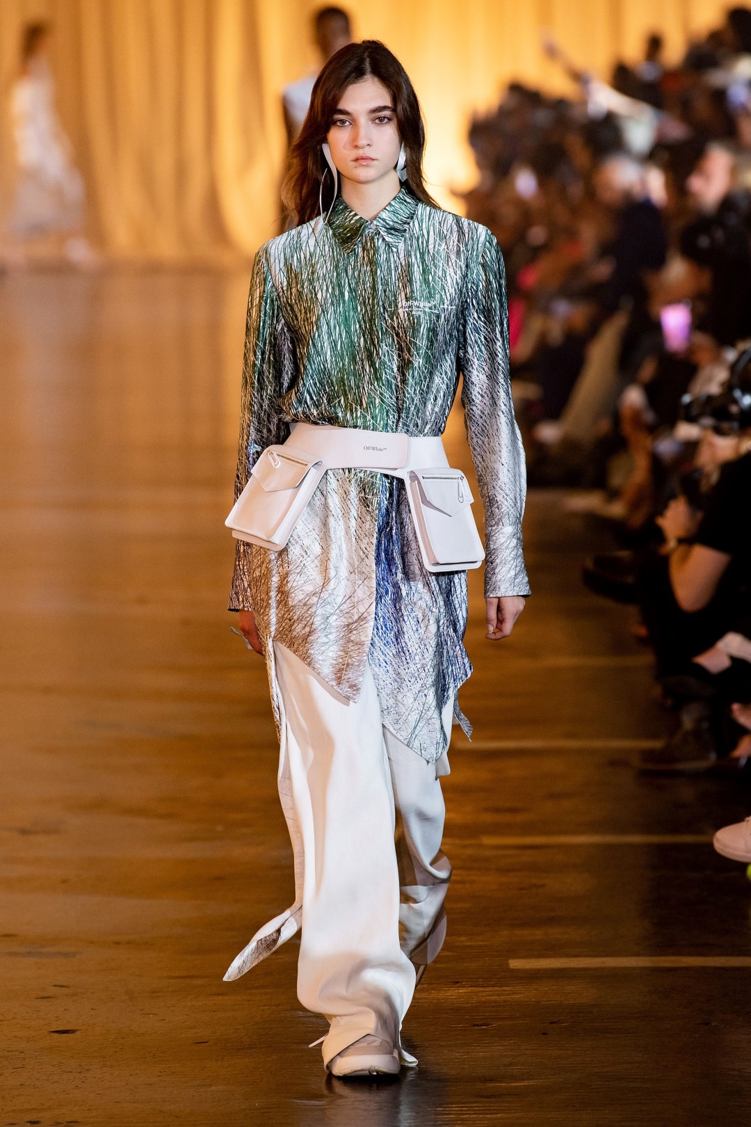 Однако шоу под названием «Meteor Shower» («Метеоритный душ») состоялось — и началось с проигрывания речи первой афроамериканки, совершившей полет в космос, Мэй Кэрол Джемисон, и выхода девушки с южносуданскими корнями, признанной главной моделью 2018 года, Адут Акеч. После ее мнималистичного платья-рубашки на подуиме появились более провокационные и спорные вещи: желтые «валенки», длинные перчатки, оверсайзовые футболки и выбеленные джинсы, в которые будто бы и правда попал метеорит. Каждый из этих нарядов имел круглый разрез (иногда даже несколько!) и был стилизован такими же сумками, которые сами Off-White назвали «нефункциональными» (зато честно!).