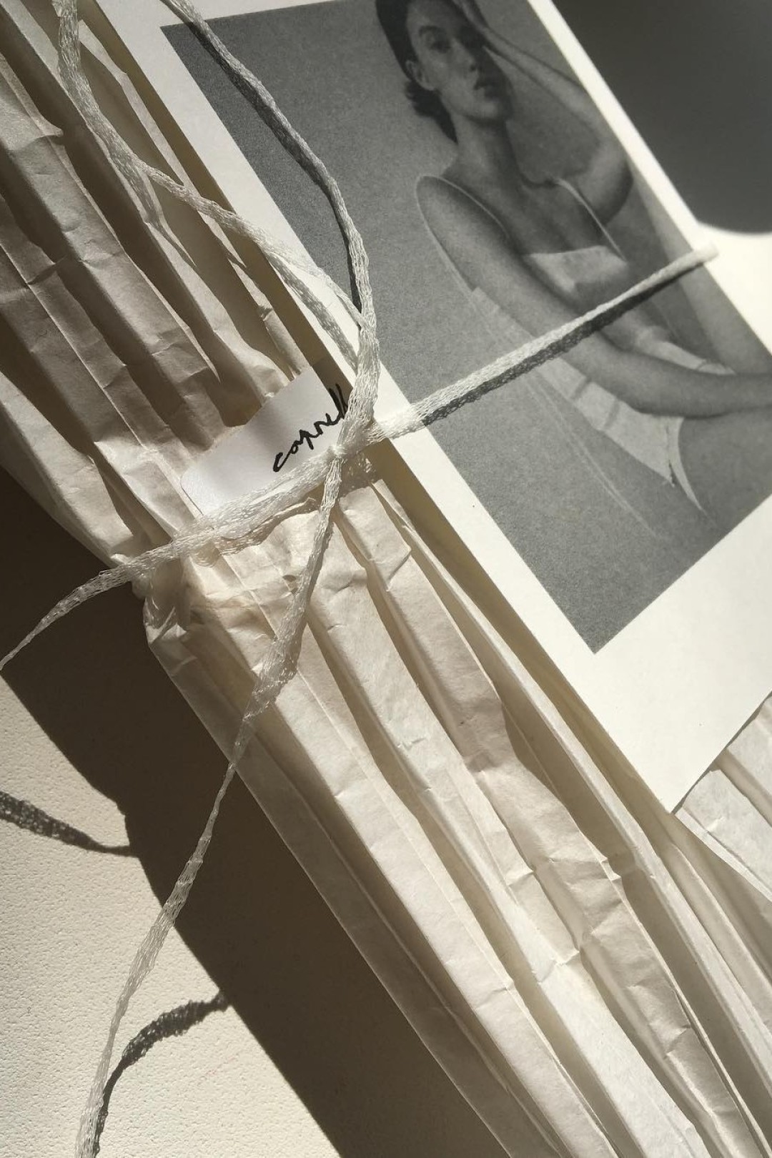 При производстве и выборе материалов для нижнего белья Corporelle мы осознанно придерживаемся экологических принципов. Это же касается и упаковки — мы используем только бумагу и текстиль, никакого пластика и синтетики. Так, наши подарочные коробки выполнены из картона и обтянуты голландским натуральным текстилем на бумажной основе. В качестве лент мы используем пряжу из шелка, найденную на стоках в Италии. Там же во время последней закупки тканей наткнулись на невероятно красивую бумагу, применяемую в производстве плиссированного текстиля. Ее остатки обычно выбрасывают, а мы их спасли, привезли в Петербург и теперь упаковываем в бумагу изделия. Особенно здорово в ней смотрится наш топ из плиссированного батиста.