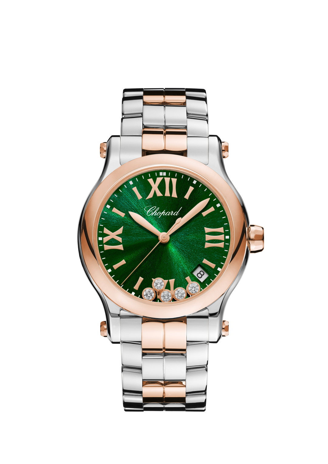 Трехстрелочник из стали и розового золота дает балет без антракта: по 36-миллиметровой зеленой сцене от каждого движения руки порхают в па д’аксьон пять свободных бриллиантов.