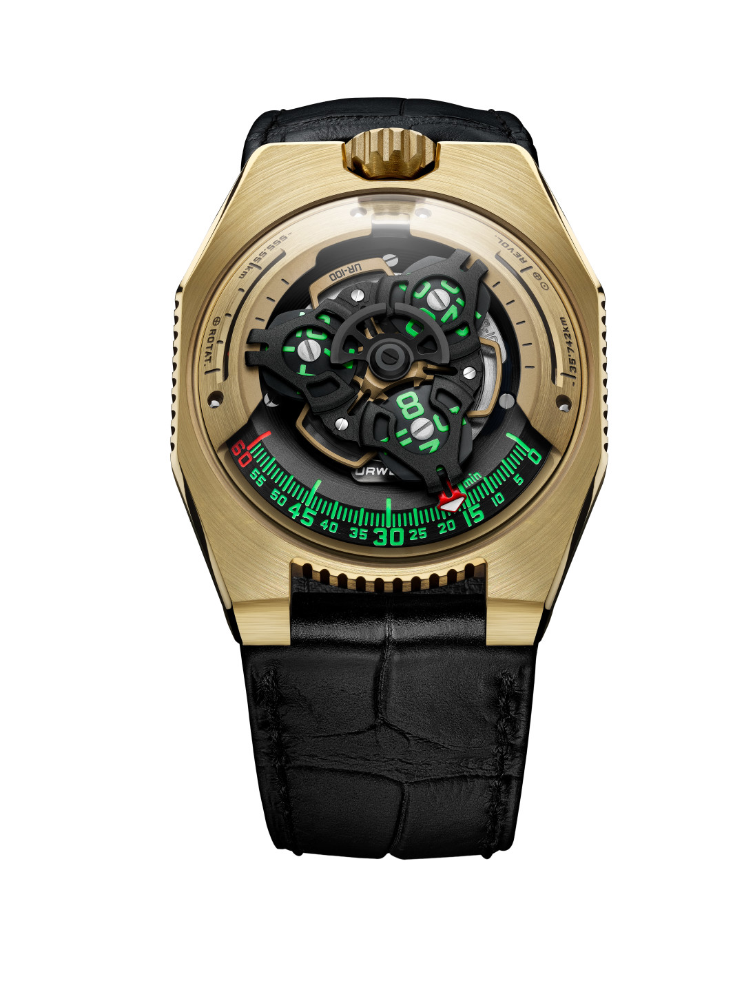 Вырезанный (всего для 25 ценителей!) из блока желтого золота сверхплоский корпус оберегает сложноустроенный часовой мозг. Время здесь указывают три беспрерывно крутящихся сателлита, а красная стрелка перескакивает с минутной шкалы на счетчик скорости вращения Земли вокруг Солнца.