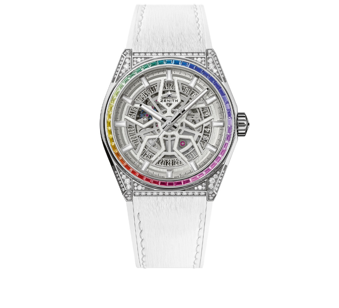 Мы скучаем зимой даже по обычной радуге. А особенно скучаем по круговой радуге, которую видно только из иллюминатора или со смотровой площадки Эмпайр-стейт-билдинг. «Ни слова больше», — решили часовщики Zenith и создали белоснежные часы с гало из 48 разноцветных сапфиров в огранке багет по безелю. В сумме со 192 прозрачными бриллиантами они весят почти полных 4 карата, а благодаря фигурной звезде циферблат похож на искусно вырезанную снежинку.