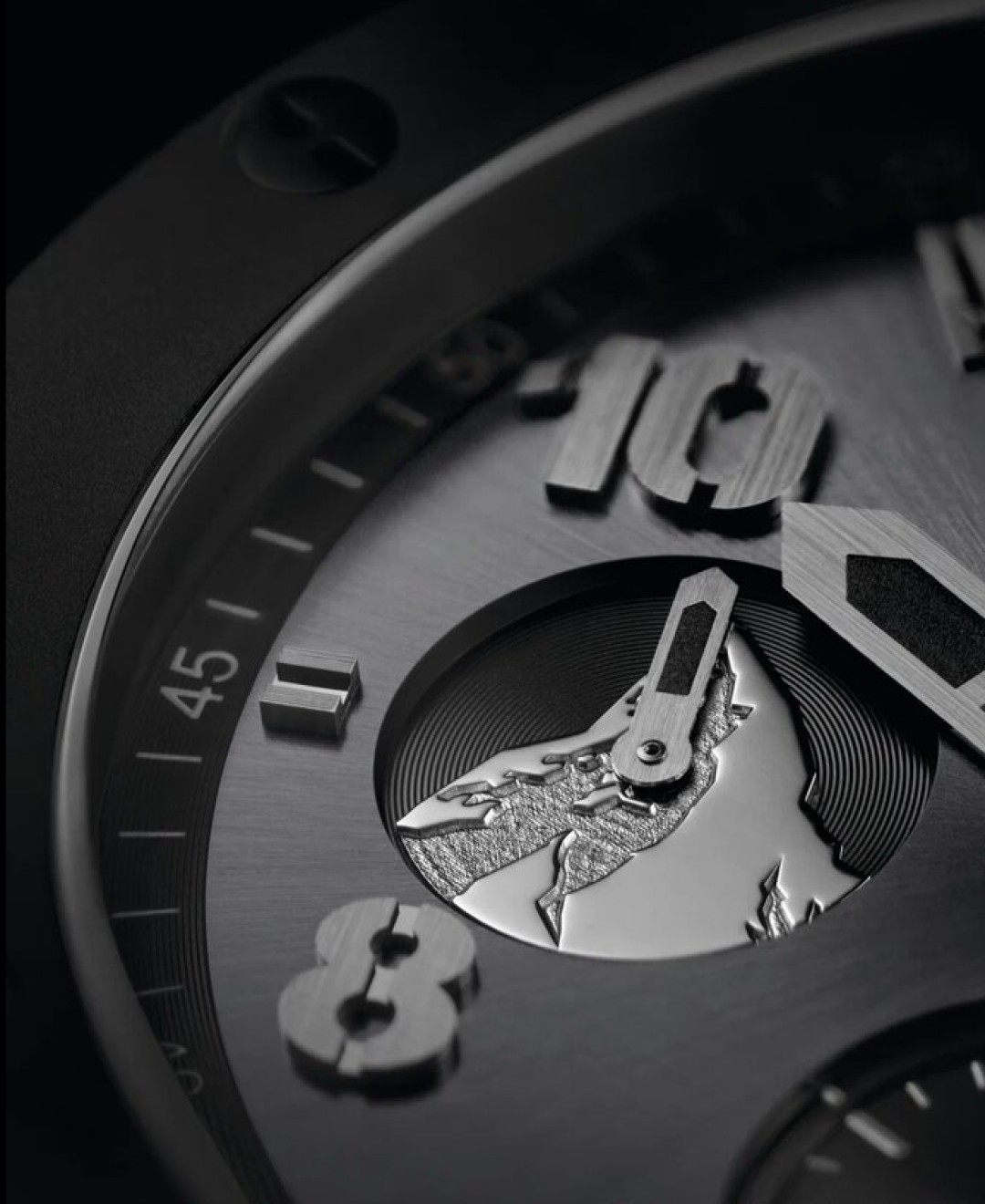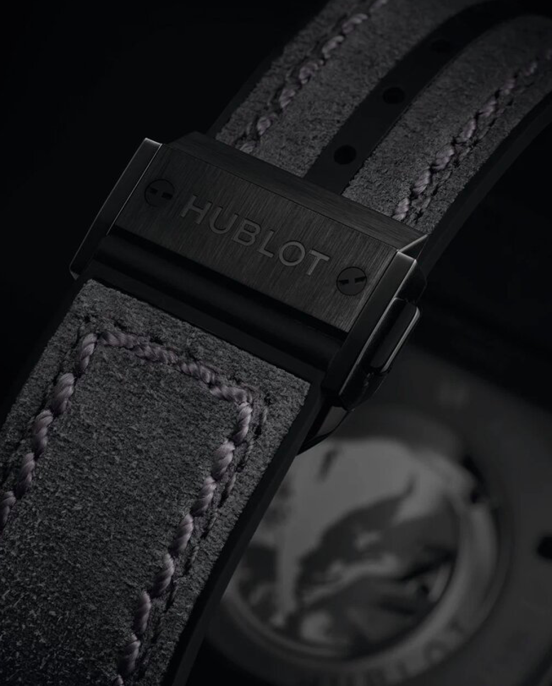 Верные эстетике All Black, часы выполнены исключительно в черных и серых тонах: антрацитовые накладные индексы, две широкие стрелки с тиснением из черного люминесцентного материала, черные резиновые ушки и черный каучуковый ремешок с серыми вставками из телячьей кожи и раскладывающейся застежкой.