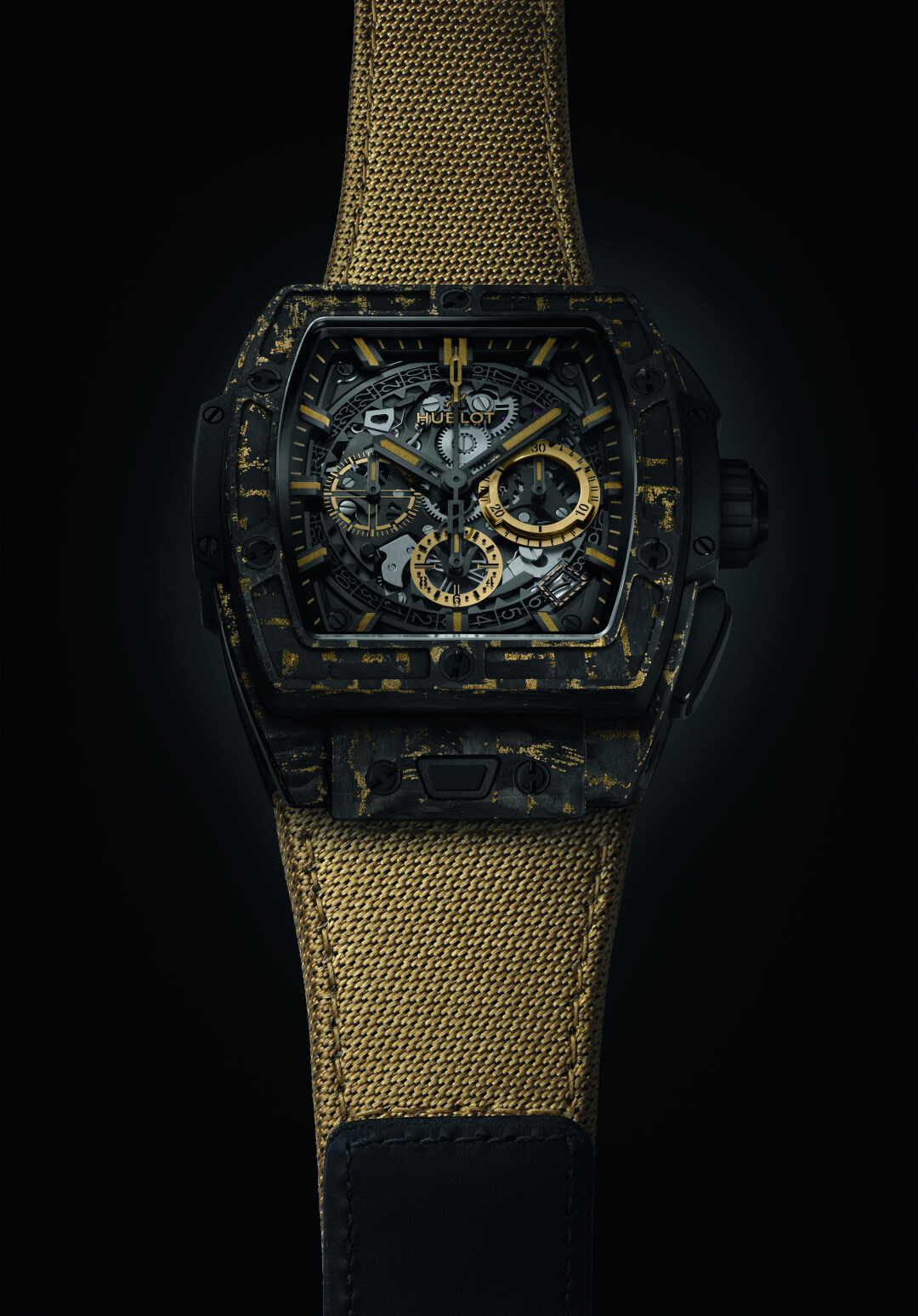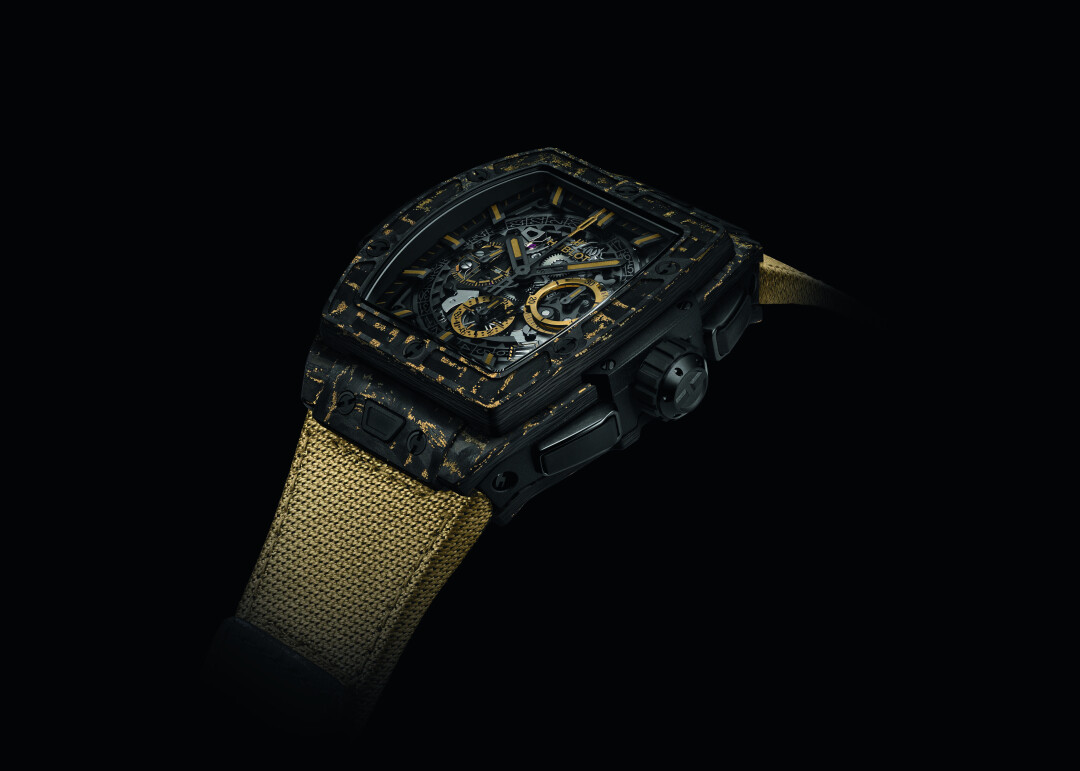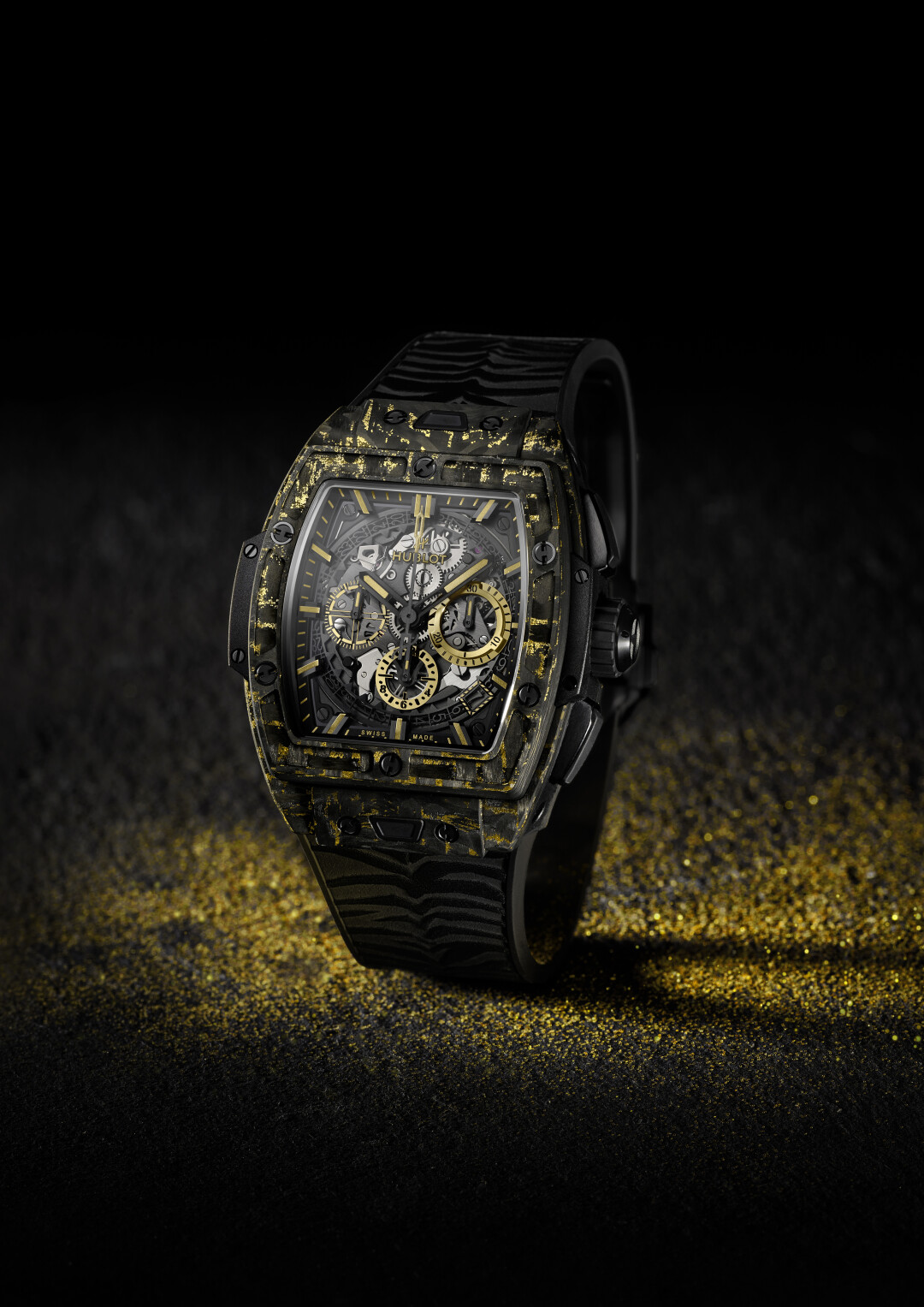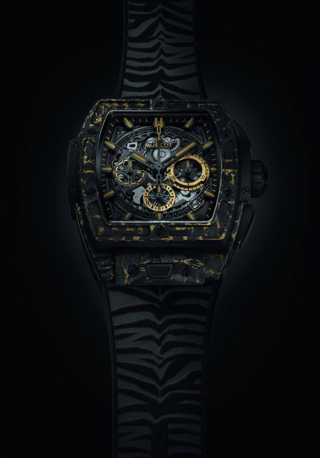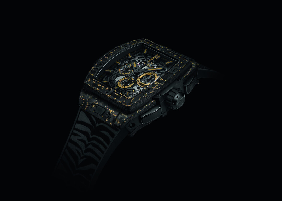 The Spirit of Big Bang Carbon Gold Tiger — это оригинальный 42-х миллиметровый корпус из матового углерода с хронографом Hublot HUB4700 и автоматическим подзаводом. Модель дополняет черный каучуковый ремешок, имитирующий полоски тигра. Узоры на ремешках не повторяются, поэтому в серии из двухсот экземпляров нет одинаковых часов. Благодаря застежке из черной керамики с титановым покрытием и запатентованной системе Hublot One-Click System каучуковый ремешок можно заменить на тканевый цвета желтого золота на липучке. Среди преимуществ The Spirit of Big Bang Carbon Gold Tiger также 50-часовой запас хода и водонепроницаемость до 100 метров.