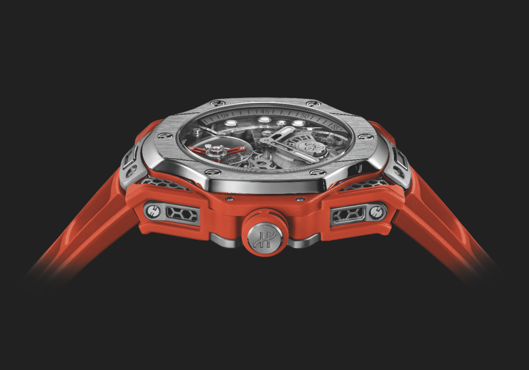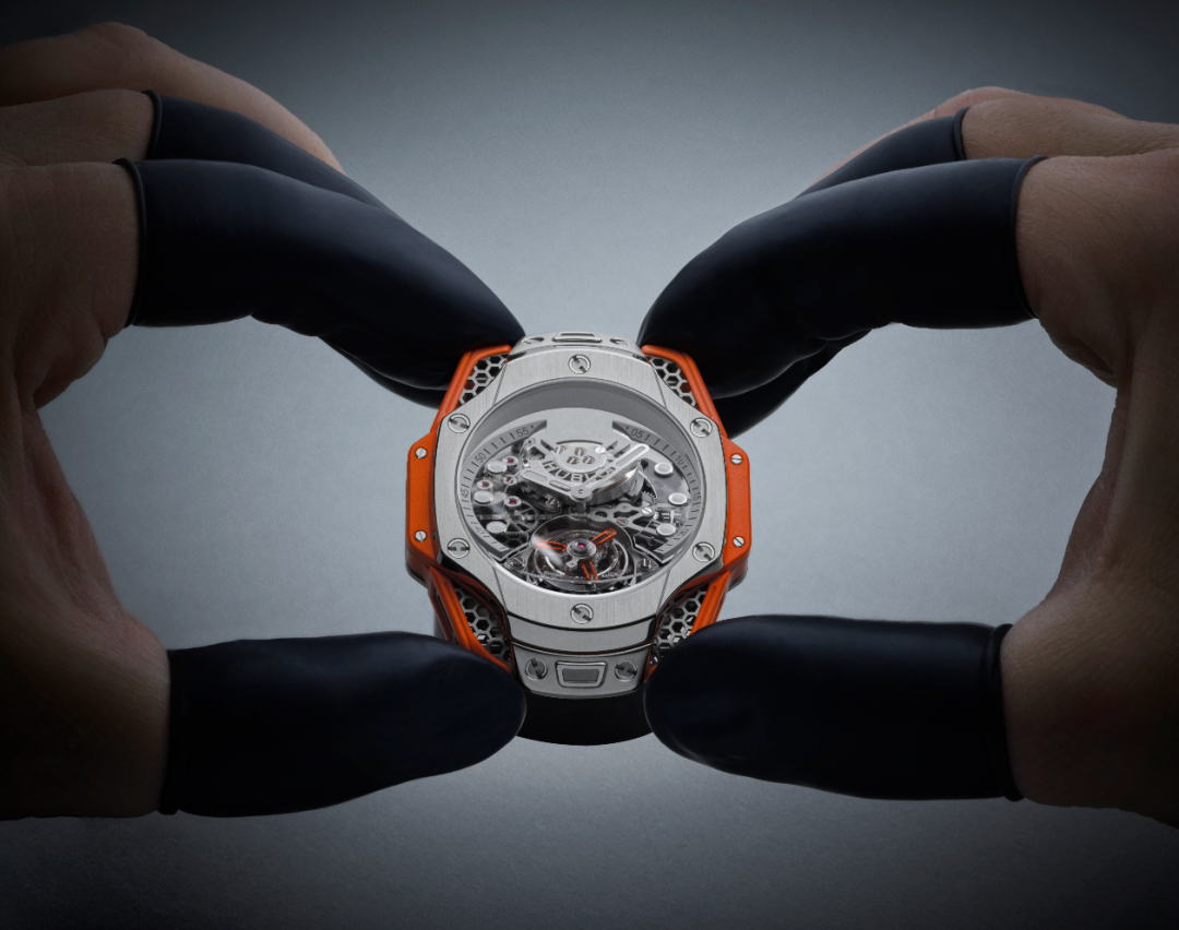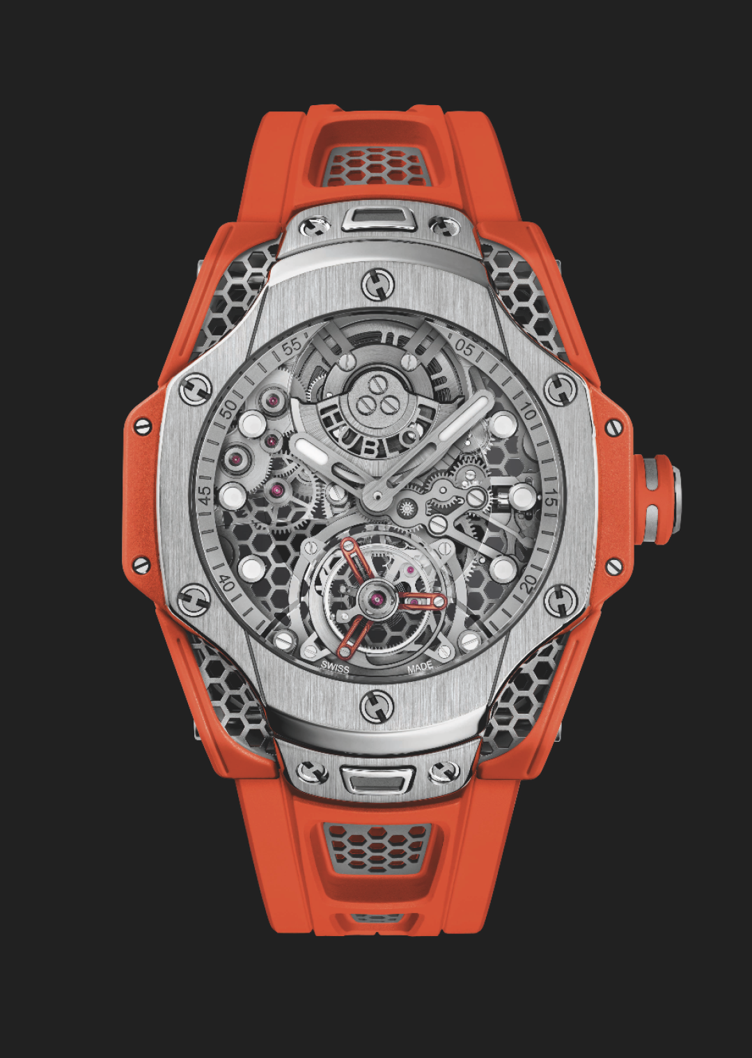 Росс, как знаток и адепт цвета, выбрал оранжевый для ремешка и акцентов на заводной головке, мосте турбийона и боковых бамперах, защищающих корпус. Оттенок ассоциируется с энергией и оптимизмом, а также создает контраст со спокойным серым цветом сатинированного корпуса и безеля. Калибр HUB6035, состоящий из 282 компонентов, работает с частотой 3 Гц и обеспечивает запас хода 72 часа.