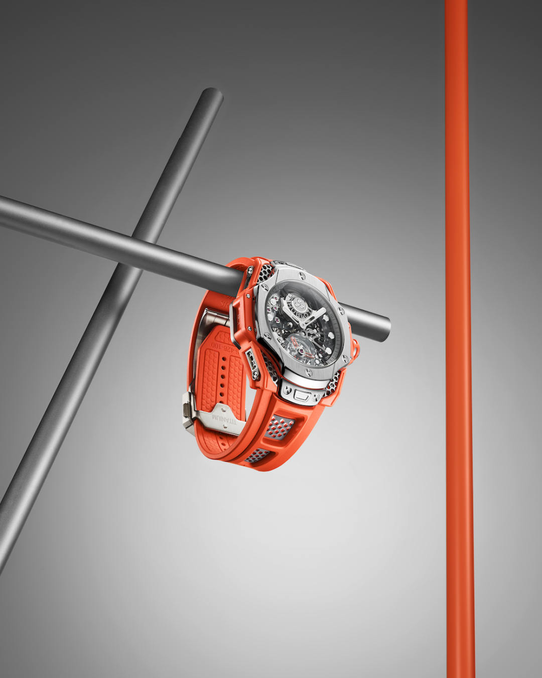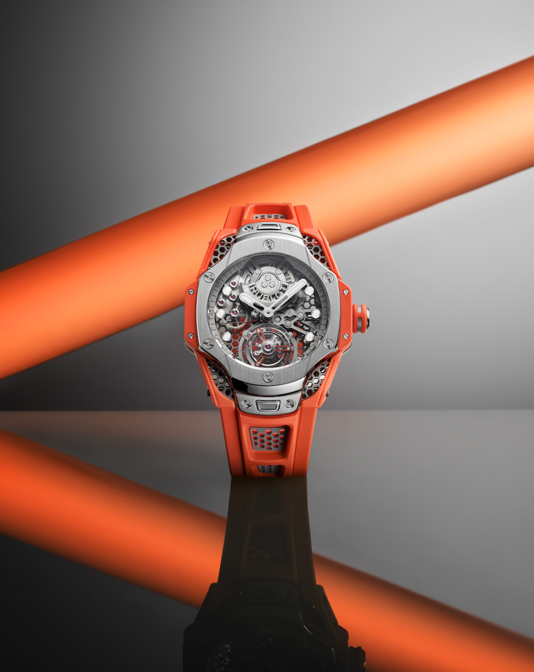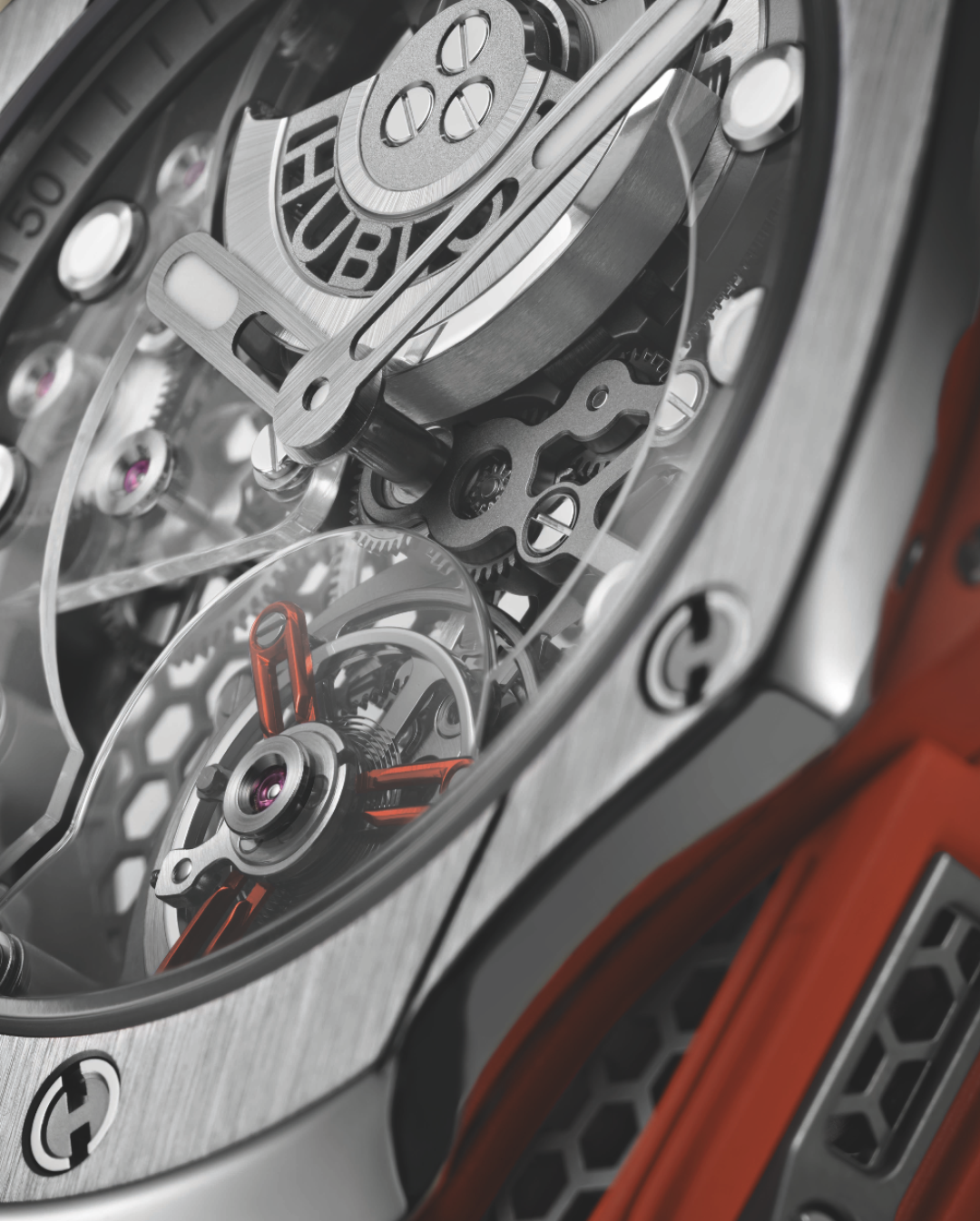 Росс, как знаток и адепт цвета, выбрал оранжевый для ремешка и акцентов на заводной головке, мосте турбийона и боковых бамперах, защищающих корпус. Оттенок ассоциируется с энергией и оптимизмом, а также создает контраст со спокойным серым цветом сатинированного корпуса и безеля. Калибр HUB6035, состоящий из 282 компонентов, работает с частотой 3 Гц и обеспечивает запас хода 72 часа.