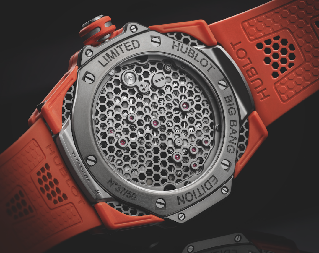 В часах Big Bang Tourbillon Samuel Ross соединились цвет, строгая геометрия, урбанистический дизайн и инновационные технологии. Характерный стилизованный шестиугольный корпус Big Bang отражен в титановой сетке с узором «соты» на сапфировом циферблате, корпусе, задней крышке и ремешке. Шестиугольник стал визуальным символом функциональности часов, ключевым элементом, проходящим через весь дизайн изделий Сэмюэля Росса. Легкая, ажурная титановая конструкция и гибкий каучуковый ремешок отвечают за комфорт.