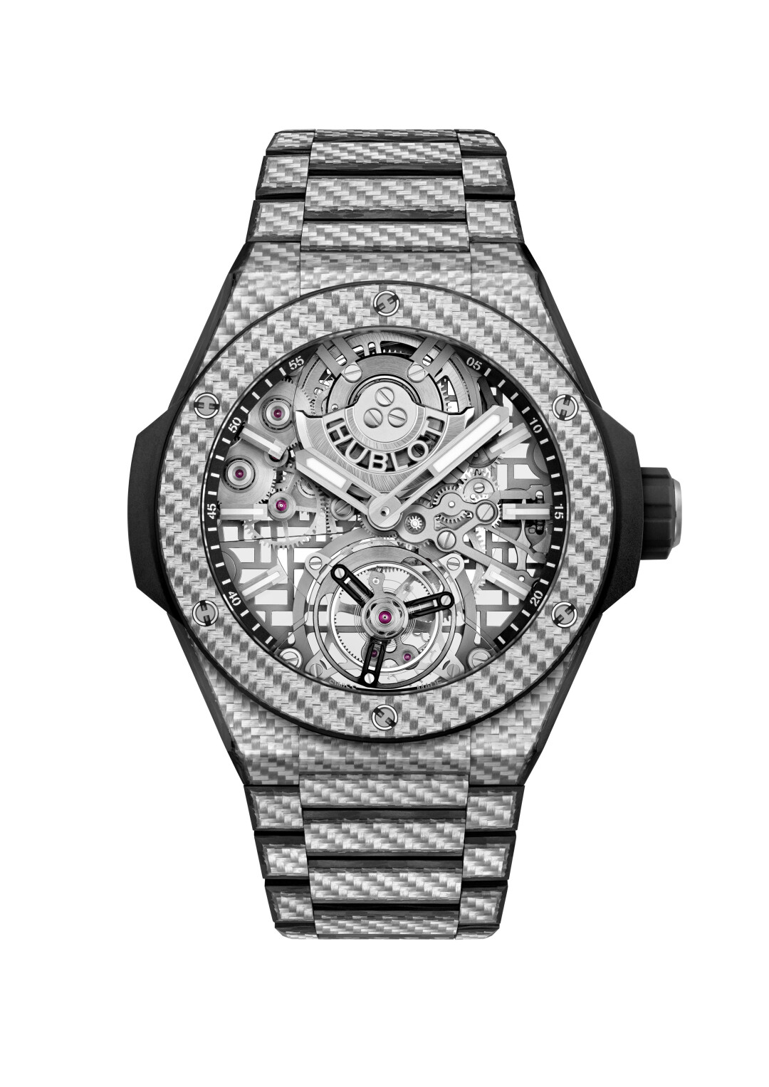 Сверхсложный механизм со скелетонированными микроротором и парящим турбийоном заковали на мануфактуре Hublot в Ньоне в 43-миллиметровый корпус с интегрированным браслетом из карбона и тексалиума (стекловолокна с алюминиевым нанослоем). Модель ограниченной серии в 50 экземпляров смотрится во всех смыслах весомо — а на самом деле Big Bang Integrated Tourbillon Full Texalium-Carbon стали одними из самых легких часов в мире для своего диаметра: 68 граммов вместе с калибром, корпусом и всеми звеньями!