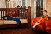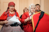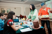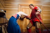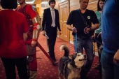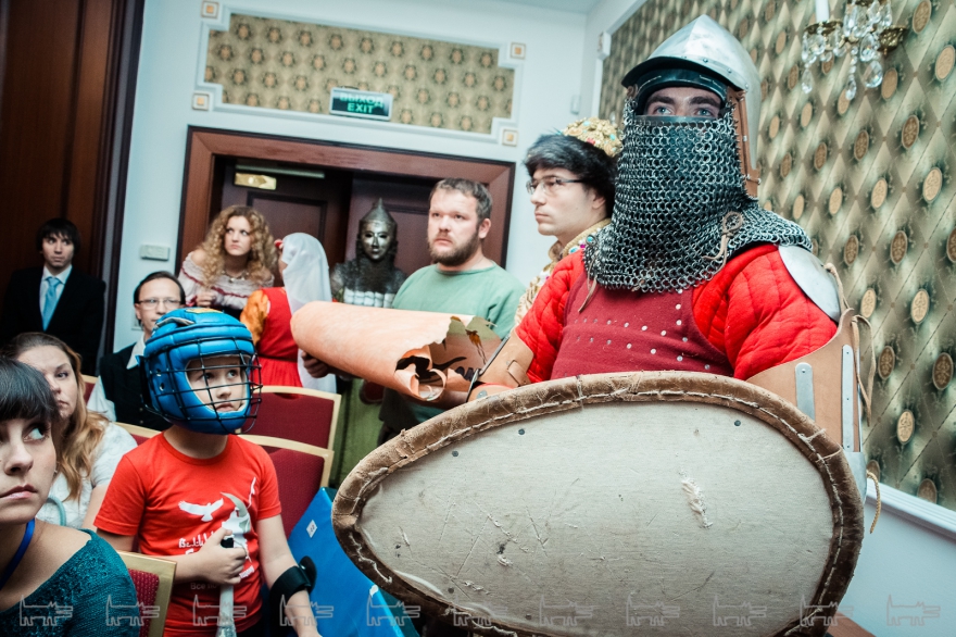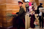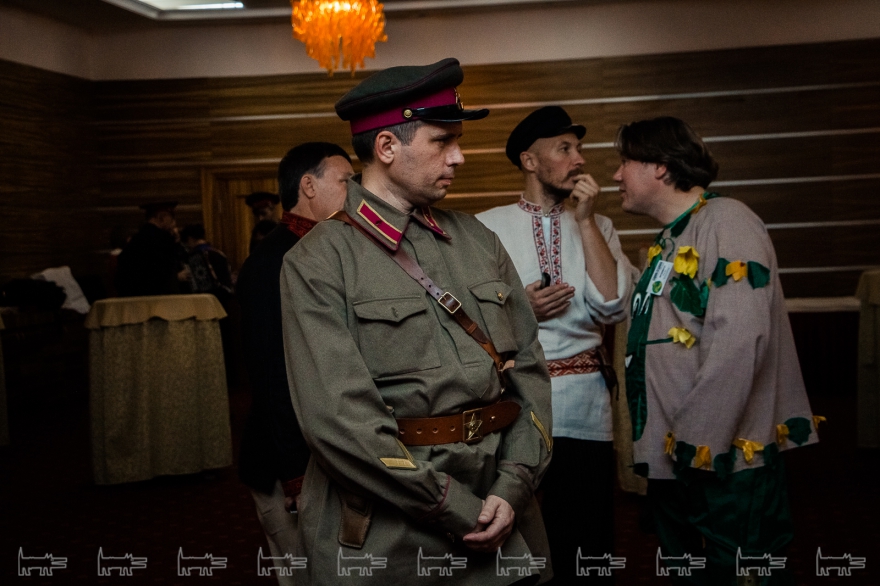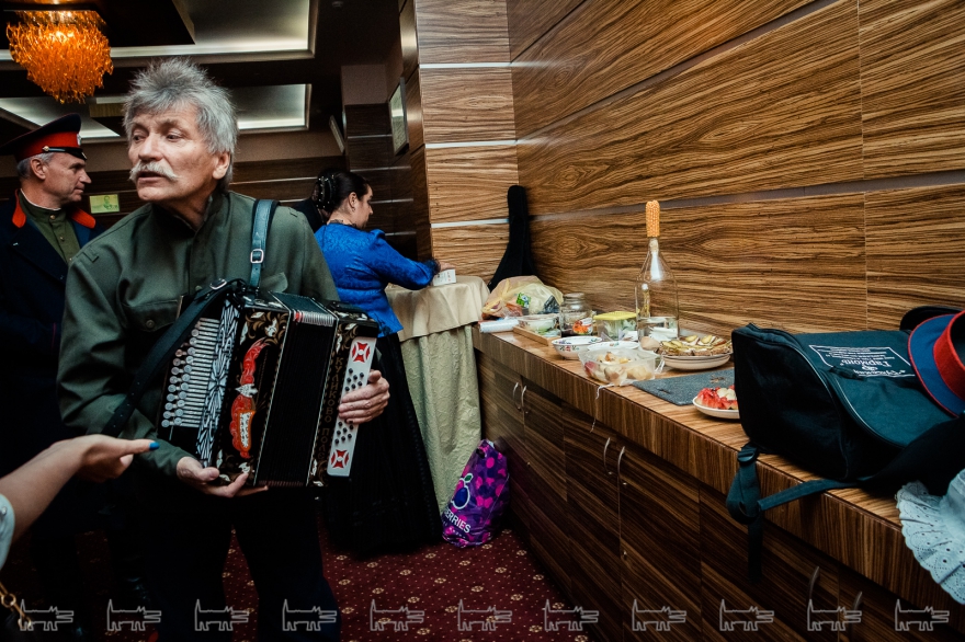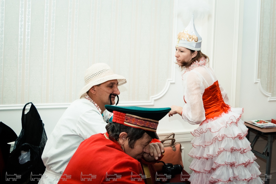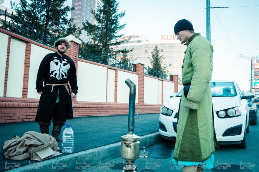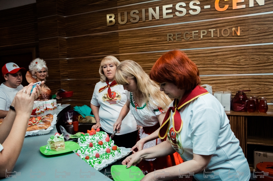 В коридорах бизнес-центра готовились к выступлениям, общались, нервничали и суетились: русские красавицы в кокошниках и без, казаки, кузнецы, козы, собаки, ожившие ягоды и пельмени. С места на место перетаскивали торты, чаи, блины, столы, сувениры, а на парковке разжигали русский самовар (внутри не разрешила служба безопасности).