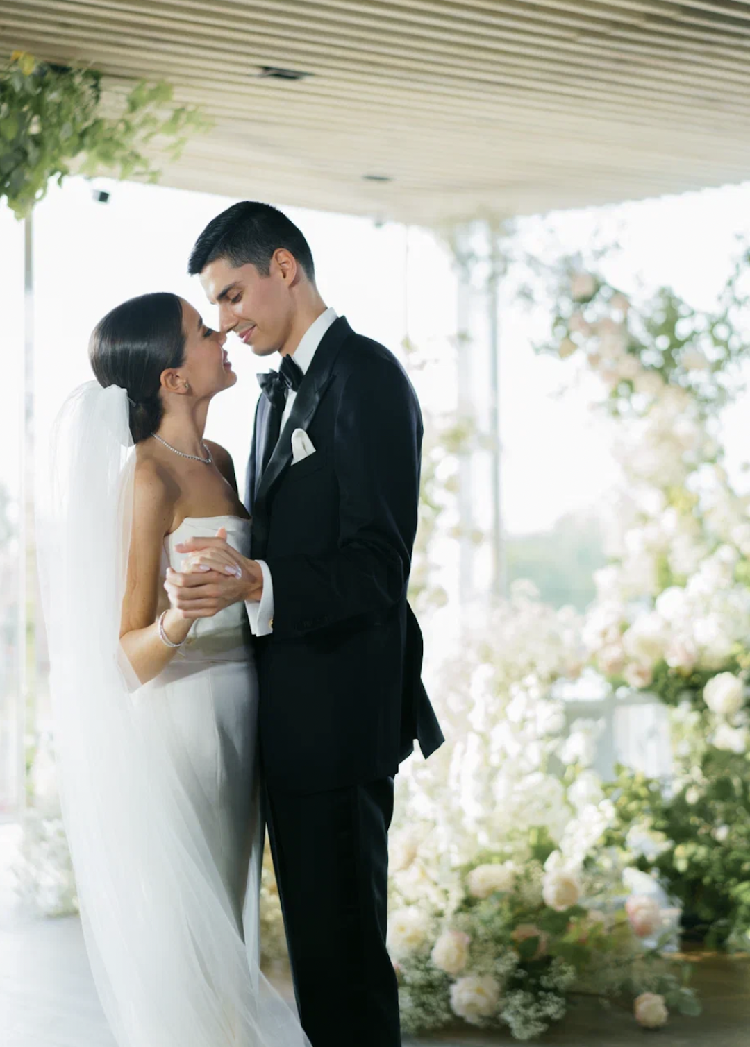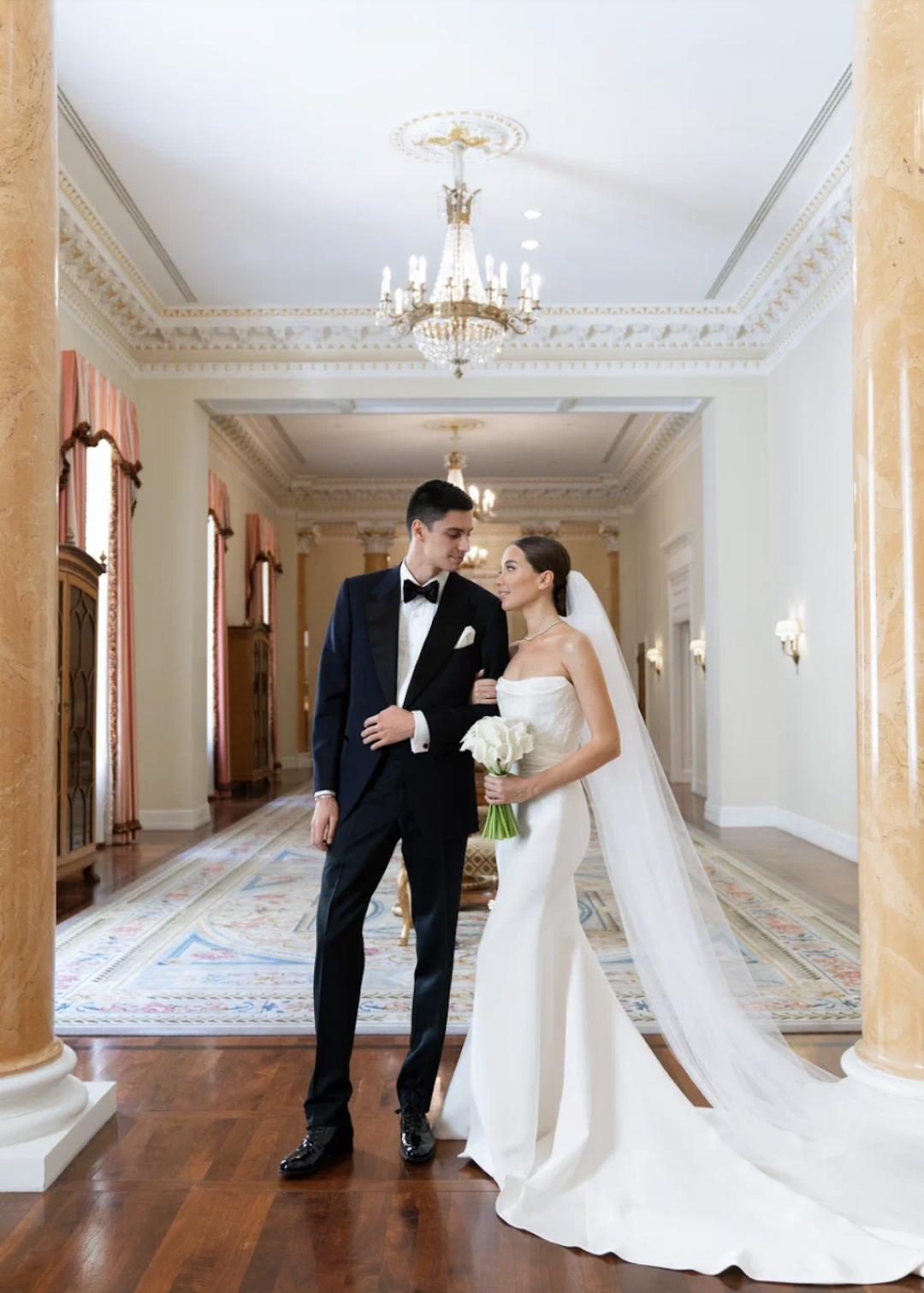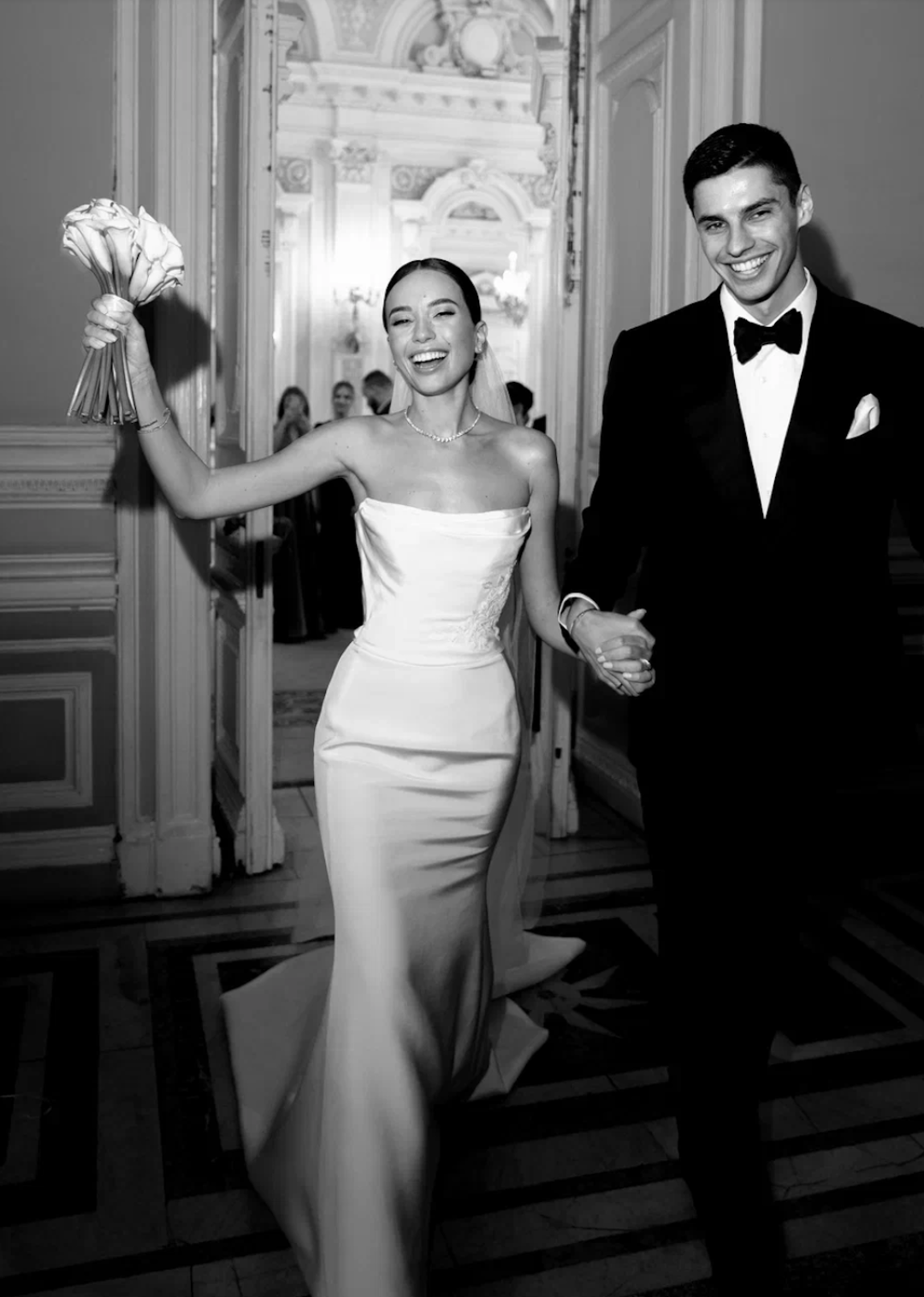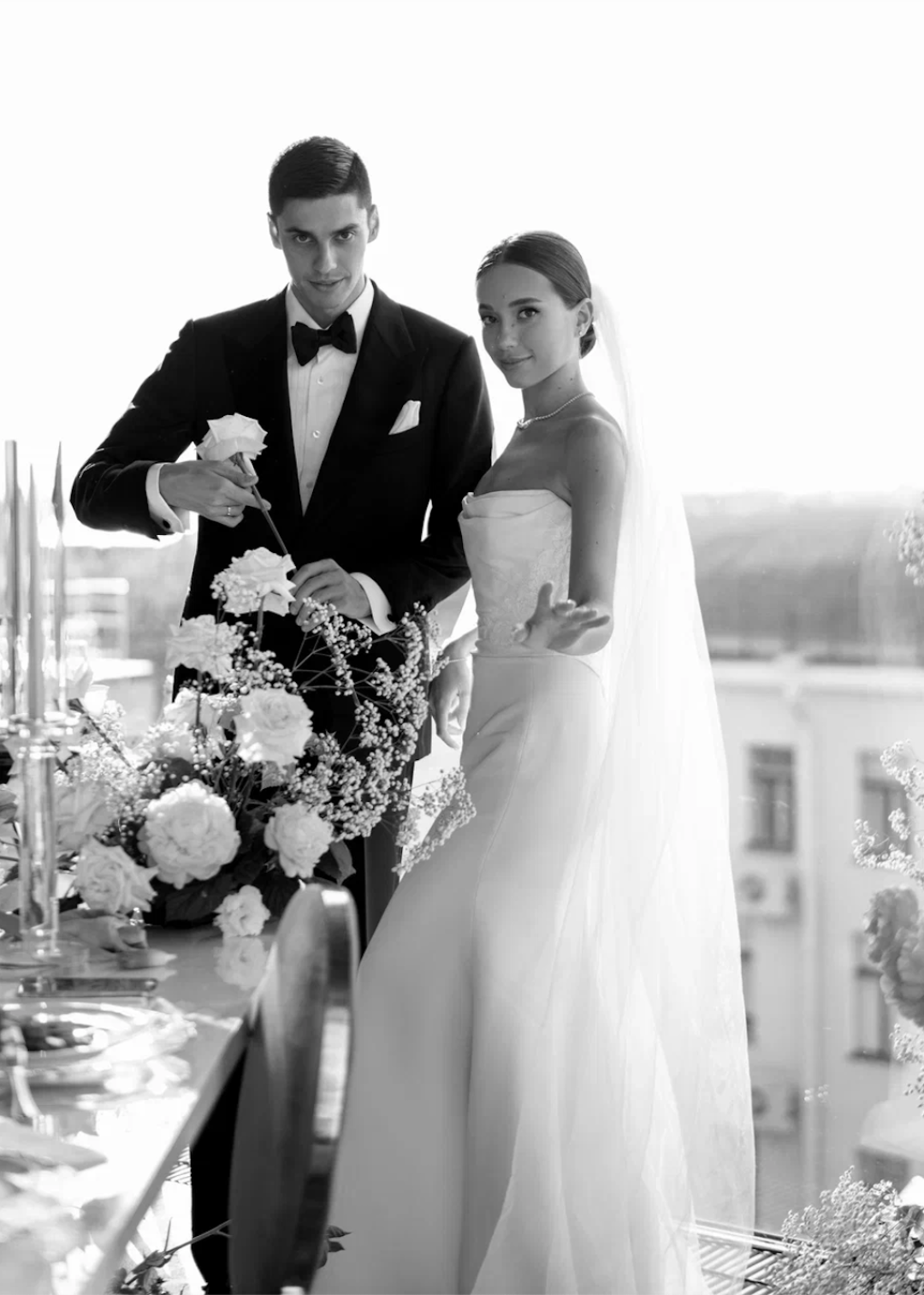 Ксения: Я всегда хотела элегантный свадебный образ: платье по фигуре, никакого кружева и страз. Чтобы платье было классическим, и, смотря на свадебные фотографии спустя много лет, я не жалела о своем выборе. Мое платье нашло меня спонтанно. Изначально я ехала в Москву в ателье с целью заказать платье определенного фасона, даже уже оставила предоплату. Однако по воле случая оказалась в свадебном салоне, где среди абсолютно не моих платьев весело ОНО — совершенно непримечательное на вешалке платье Ines Di Santo. Но как только я его надела, та самая магия случилась.