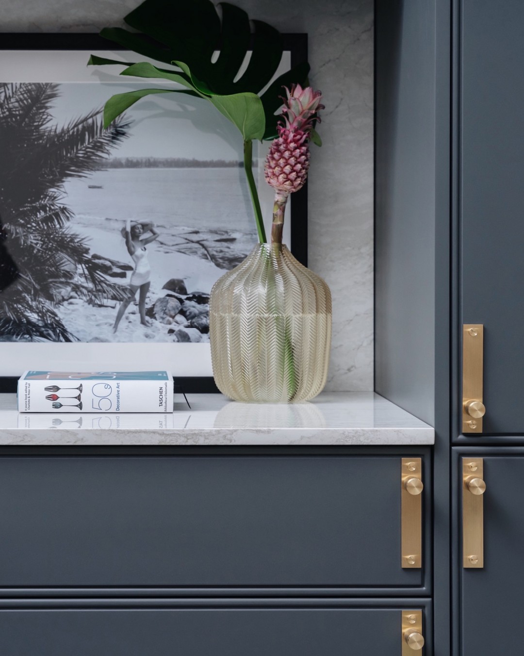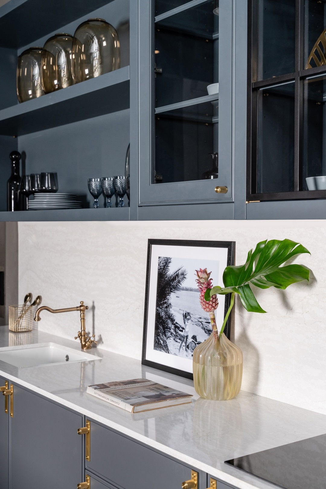 В пространстве кухни Brutal английский классический интерьер соединяется с ультра актуальными деталями. Стеклянные дверцы как в традиционном английском интерьере – и при этом брутальные и современные алюминиевые перегородки. Классическая встроенная мебель – и при этом технологичные выдвижные ящики, дополненные системой плавного закрывания. Важная особенность дизайна – латунные детали: крепежные элементы, полкодержатели, ручки, вырезанные из единого куска латуни. Идея последних, кстати, принадлежит известным дизайнерам Buster&Punch: создавать интересные творческие тандемы вообще характерная черта Dantone Home.