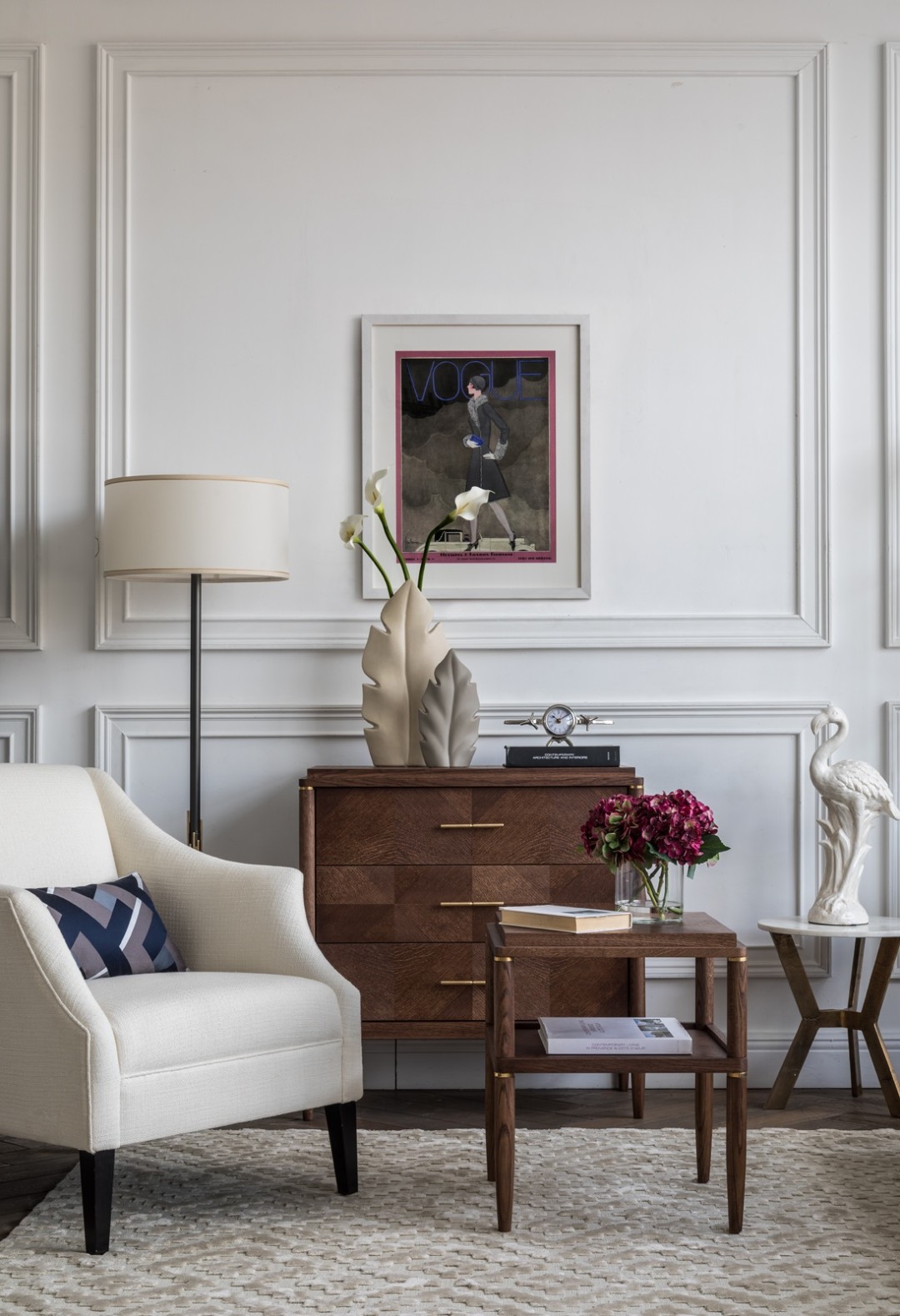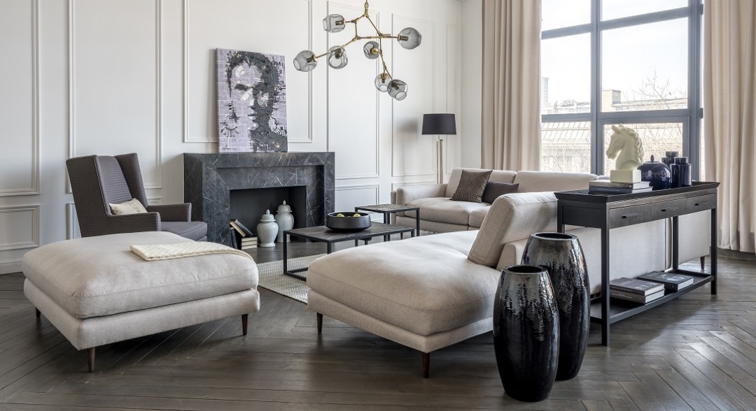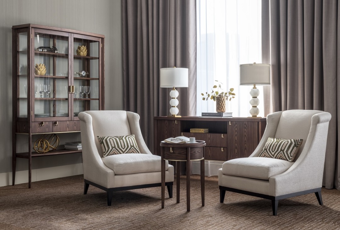 New Classic – еще одна коллекция Паттерсона, созданная для Dantone Home и отсылающая к классическим английским интерьерам. Витрина, комод и столик с характерными округлыми силуэтами будут уместны в кабинете и особенно – в гостиной. Некоторые детали – например, вставка из телячьей кожи на письменном столе или закругленные фасады из формованного стекла, украшающие витрину, могут стать любопытной темой для смол-тока. Интерьер дополняет кресло Льюис. Благодаря небольшому наклону спинки и вытянутому силуэту, оно выглядит очень компактно. При этом сидеть в нем мягко и уютно.