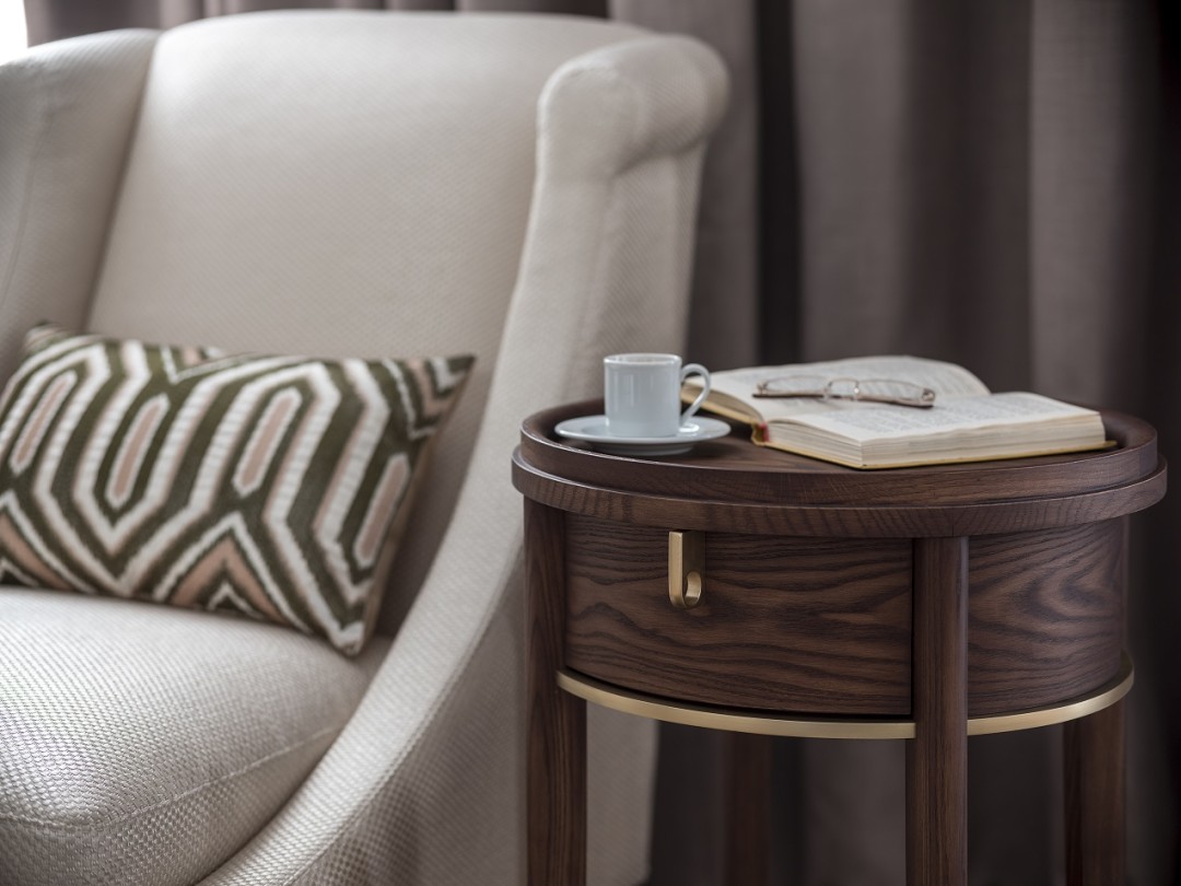 Главная дизайнерская находка этой коллекции Джеймса Паттерсона – эффект невесомости. Даже не верится, что столик выполнен из массива дуба: при желании его можно легко передвигать по дому. Изделие не только имеет небольшой вес, но и выглядит изящно – все благодаря вынесенным чуть за границы столешницы круглым ножкам с декоративными латунными элементами. Соединение сразу несколько оттенков дуба в оформлении фасадов комода и столика (техника маркетри) создает интересный 3D-эффект.