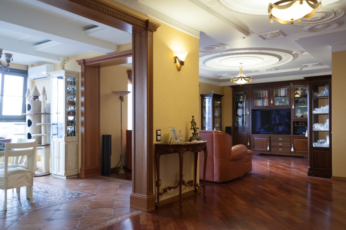В жилой комплекс «Монблан» специалист по работе с дизайнерами AFWR Тоня Гинзбург переехала четыре года назад. Дом находится в исторической точке с города: к квартире прилагаются бонусы в виде панорамного вида, громадных холлов, подсветки фасадов, колонн и цветников. Ремонтом квартиры девушка не занималась — доверилась родителям. Тем не менее, в классическом интерьере с лепниной на потолке, среди статуэток и люстр Тоня чувствует себя гармонично. Излюбленное место всех членов семьи — столовая, плавно переходящая в гостиную: с паркетным полом, высоким потолком и панорамными окнами.