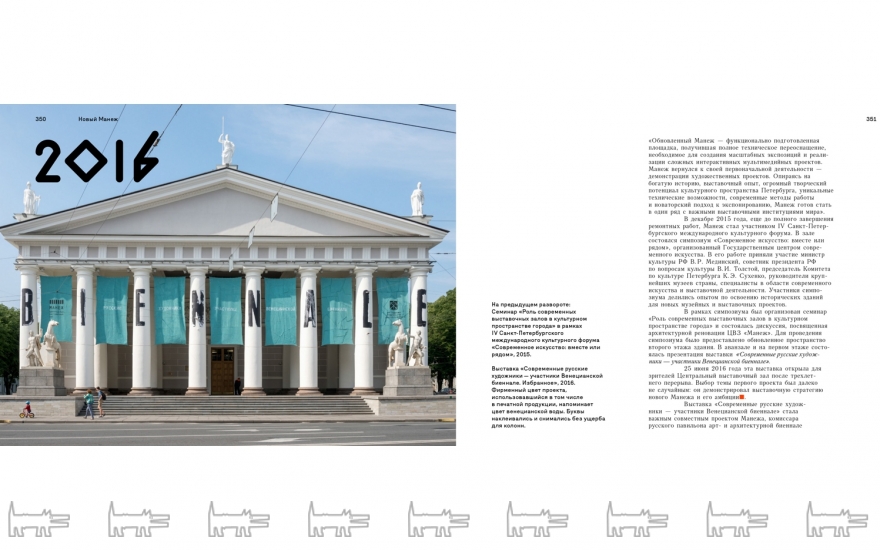 Открывшийся прошлым летом после реконструкции главный выставочный зал города сразу порадовал актуальным архитектурным решением, предложенным Александром Кривенцовым. За полтора года стало ясно, что за историческим фасадом с его современной начинкой скрывается выверенное концептуальное содержание — плод усилий новой команды директора Павла Пригара и главы попечительского совета Семена Михайловского. В ЦВЗ динамично сменяют друг друга выставки (хиты — «Современные русские художники — участники Венецианской биеннале», «Китайская армия», «70-е. Со_при_частность»), дополненные яркими камерными проектами на территории вокруг «Манежа» («Нос Кваренги», стрит-арт-проект «НЕлишний человек»). Книжный магазин, сувенирная продукция и каталоги довершают оптимистическую картину.