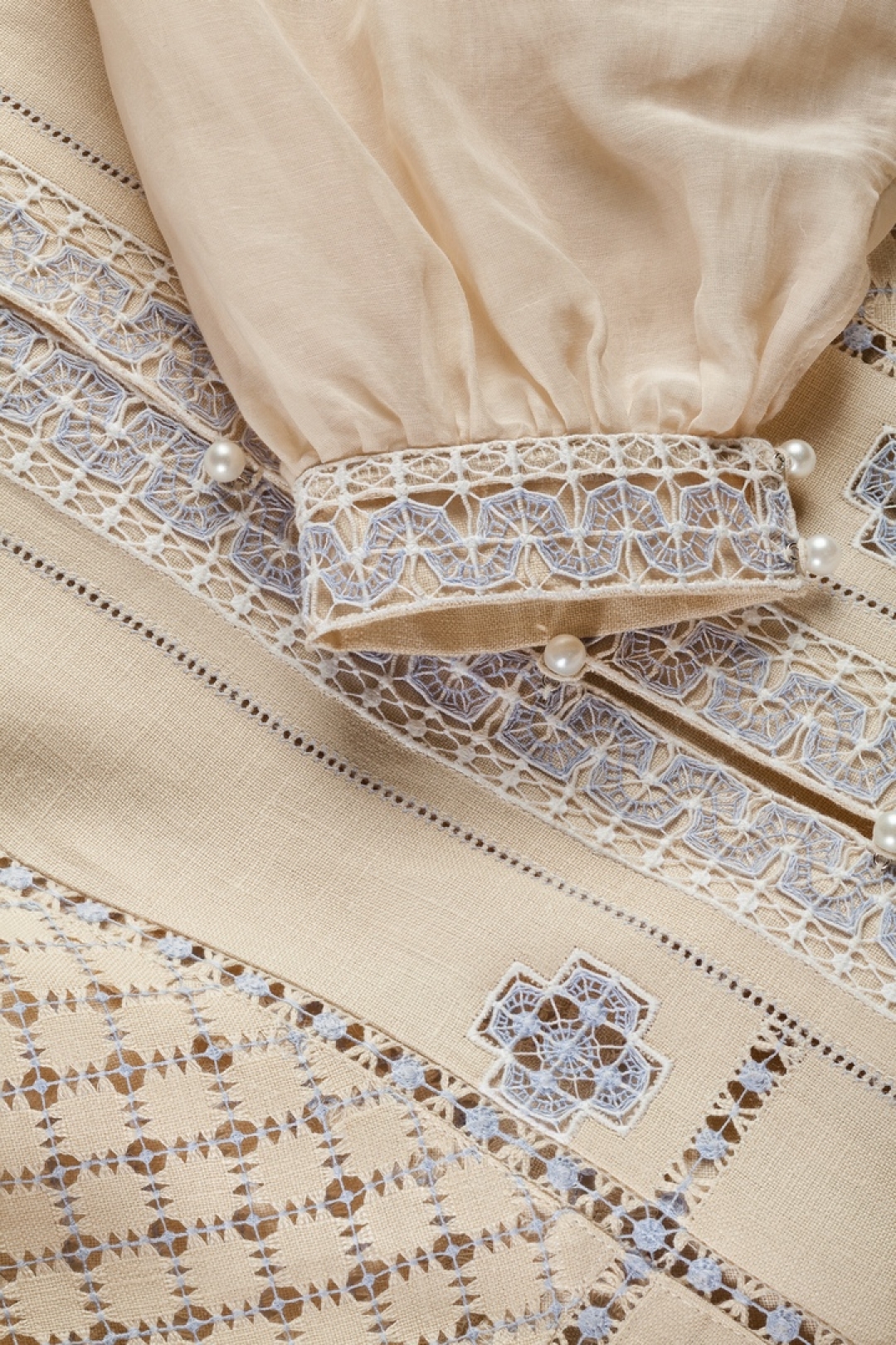 Александра: Мама Антона Татьяна Андреевна передала мне по наследству блузку из крепдешина с крестецкой строчкой, которая ей, в свою очередь, досталась от бабушки Антона. Теперь эта вещь хранится в музее фабрики. Сейчас там как раз идет опись экспонатов, с которой нам очень помогает бывший сотрудник Новгородского музея-заповедника, эксперт по крестецкой строчке Светлана Ивановна Кузнецова. Она просто кладезь знаний: может с точностью до пяти лет определить, когда и каким автором была сшита каждая вещь. Благодаря ей у нас появились планы на создание книги о нашем промысле.
