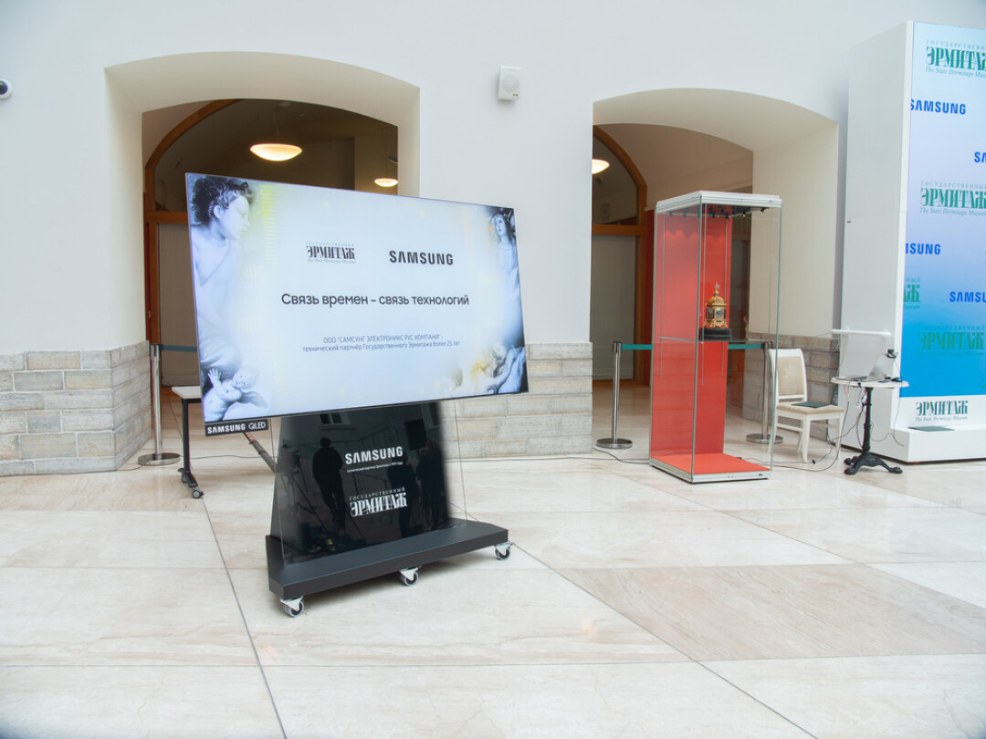 Партнерство компании Samsung и Государственного Эрмитажа началось в 1997 году с реализации программы технического оборудования Главного вестибюля Зимнего дворца. С тех пор комплекс регулярно модернизируется с помощью техники Samsung. Например, в Павильонном зале Малого Эрмитажа размещена LFD панель, где можно увидеть фильм, посвященный работе часов «Павлин»; в арке Главных ворот Зимнего дворца досмотровой модуль был оснащен телевизионными панелями Samsung, также музею передан телевизор QLED 8K с процессором Quantum на базе искусственного интеллекта, который улучшает качество исходного изображения в зависимости от освещенности помещения.