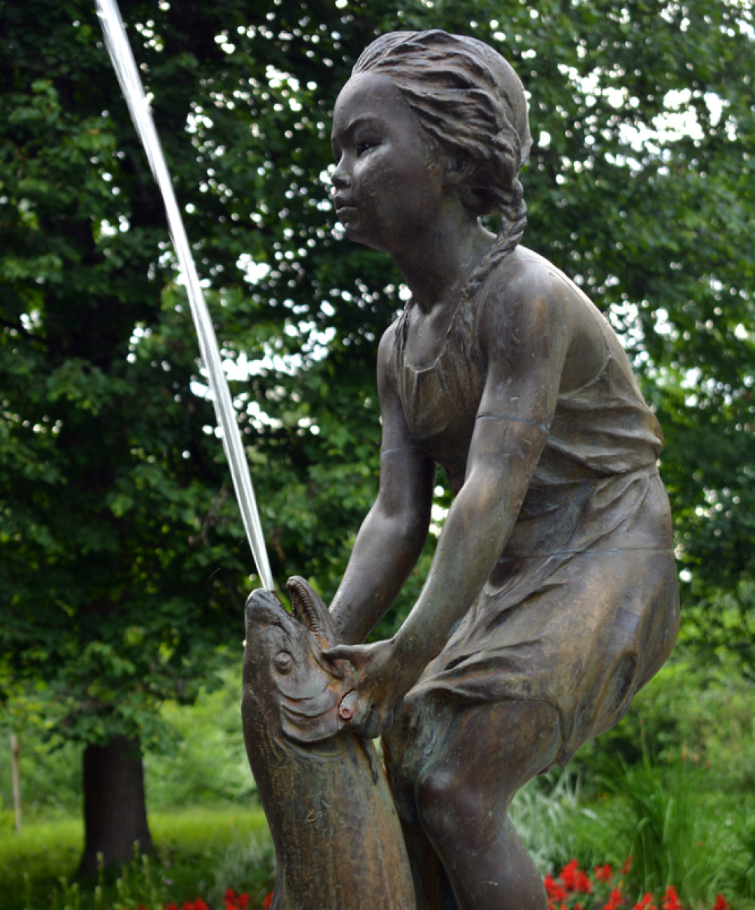 Где девочка уверенно сжимает рыбе жабры, пока у той изо рта хлыщет, содрогаясь, струя воды. Сия милая скульптурная зарисовка должна была стать частью каскада фонтанов, но средств не хватило. Зато и девочка, и рыба стали самостоятельными персонами, радующими горожан и туристов.