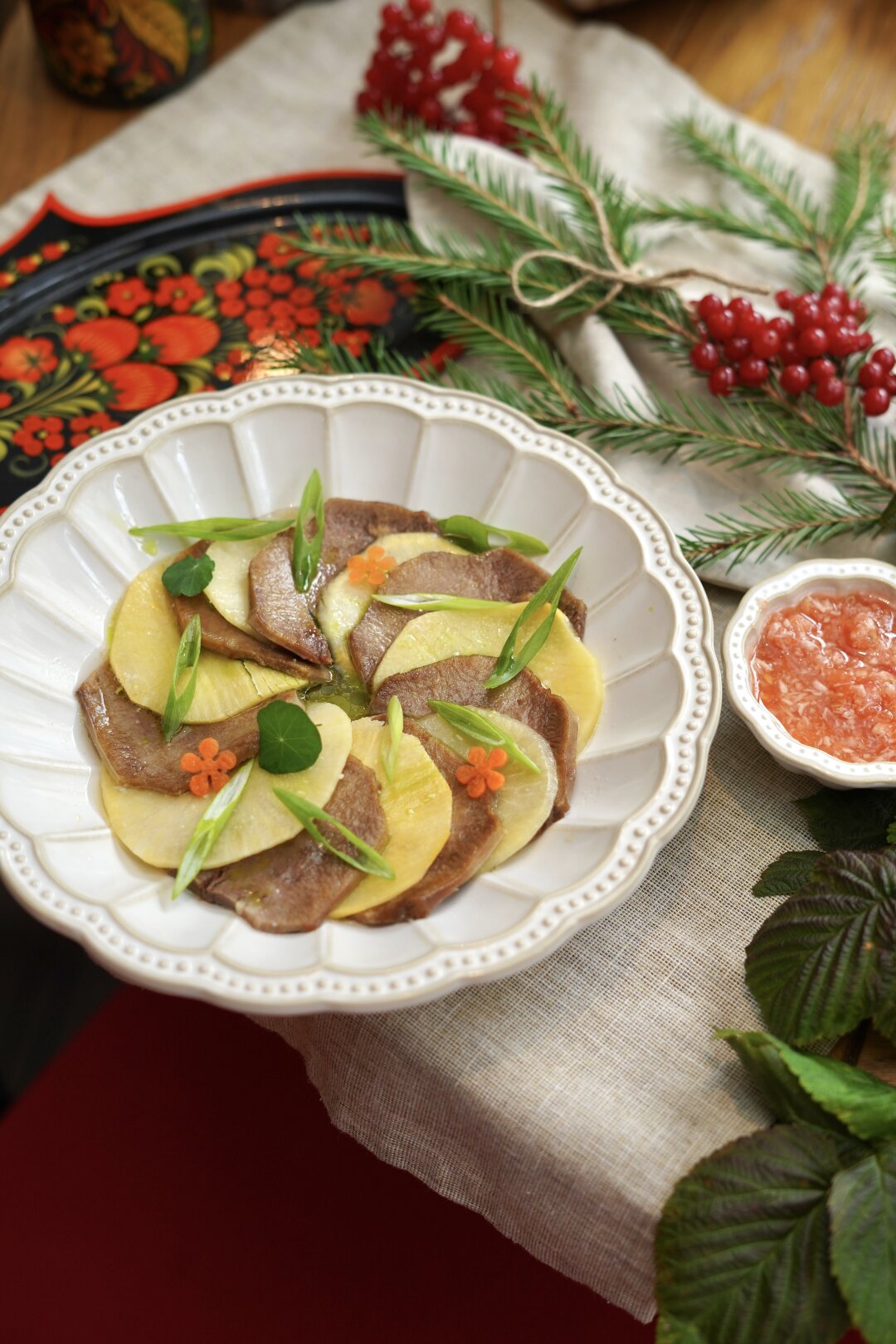 «Пареная репа» – комбо двух моих любимых продуктов! Репу я запариваю старорусским образом: со сливочным маслом, солью и травами. А телячий язык варю с луком, морковью и другими кореньями. Соус – фирменный «ванеевский» хренодер (готовлю по семейному рецепту): сочетание нежного вкуса говядины с ядреной остротой русской репы. Надо пробовать!