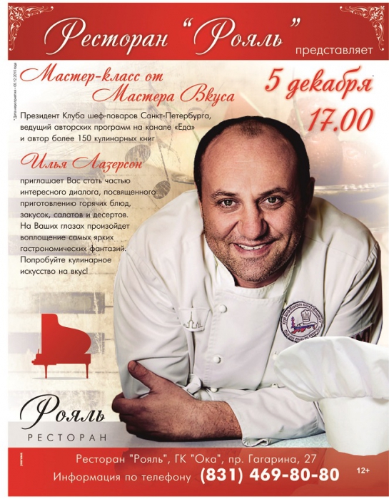 Президент Клуба шеф-поваров Санкт-Петербурга, ведущий авторских программ на канале «Еда» и автор более 150 кулинарных книг Илья Лазерсон приглашает гостей стать частью интересного диалога, посвященного приготовлению горячих блюд, закусок, салатов и десертов. На глазах изумленной публики произойдет воплощение самых ярких гастрономических фантазий. Попробуйте кулинарное искусство на вкус!