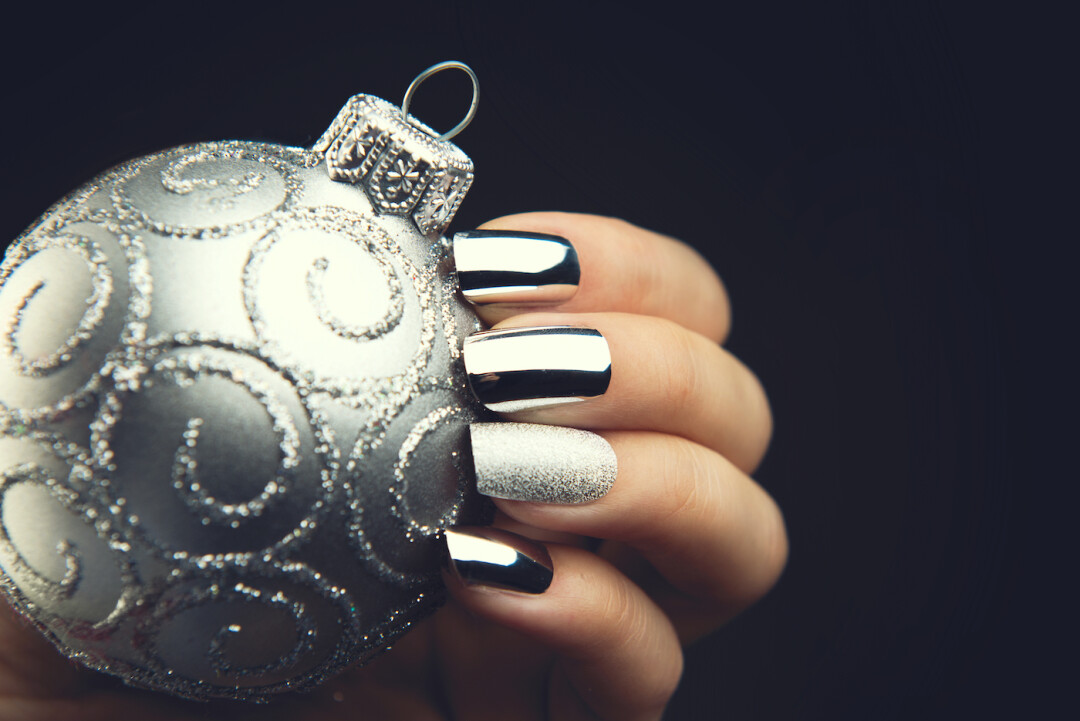 Как превратить всем известный френч в новогодний маникюр? Очень просто! Надо только заменить цвета лака — и вуаля! — модный новогодний нейл-дизайн готов! Особенно актуальны серебристые оттенки, но можно использовать и другой цвет — в зависимости от образа, который вы выберете для новогодней ночи.