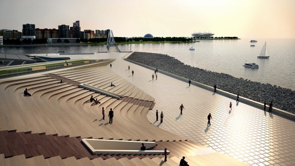 Планируются: гигантский паркинг на 2000 автомобилей, обращенный к воде амфитеатр, высотная смотровая площадка. «Лахта-центр» и парк 300-летия соединит крытый пешеходный мост.