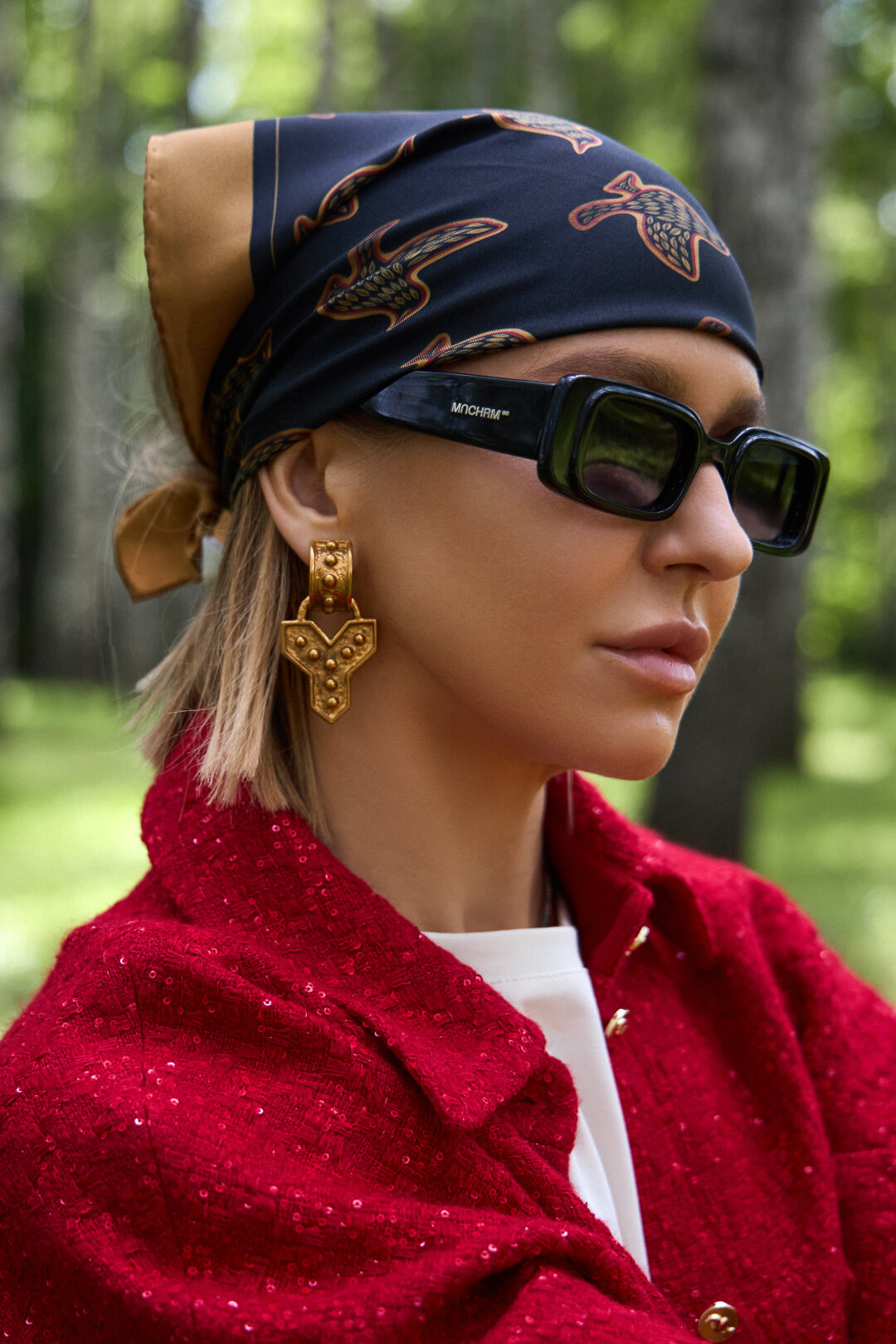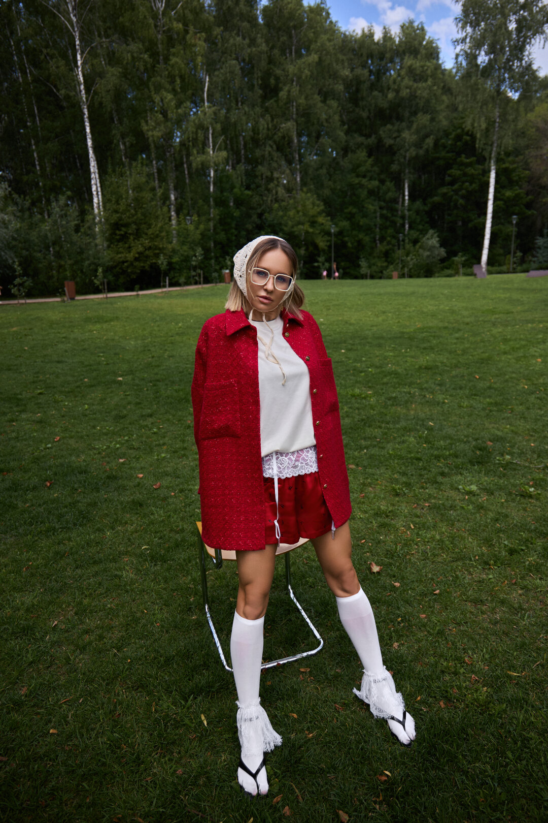 Одежда: шорты, футболка, рубашка, платок «ХОХЛОМА x АЛЕНА АХМАДУЛЛИНА», серьги SAINT LAURENT, обувь BEFREE