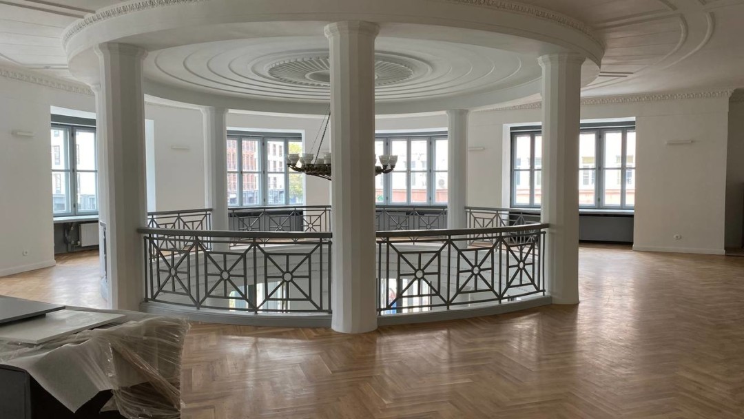 Внутри провели реставрацию главной входной группы и лестничного марша до 4-го этажа, а также части помещений 3-го этажа. Восстановили лепной декор, ступени, кирпичную кладку, декоративное ограждение лифта.