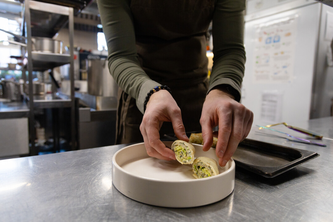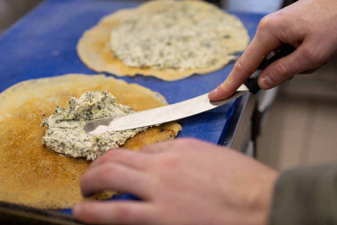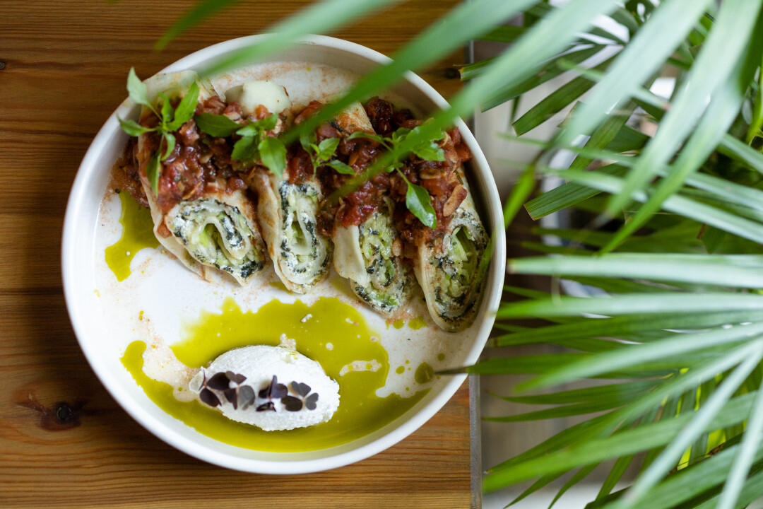 Блинчики из рисовой муки с рикоттой и шпинатом под соусом из бакинских томатов