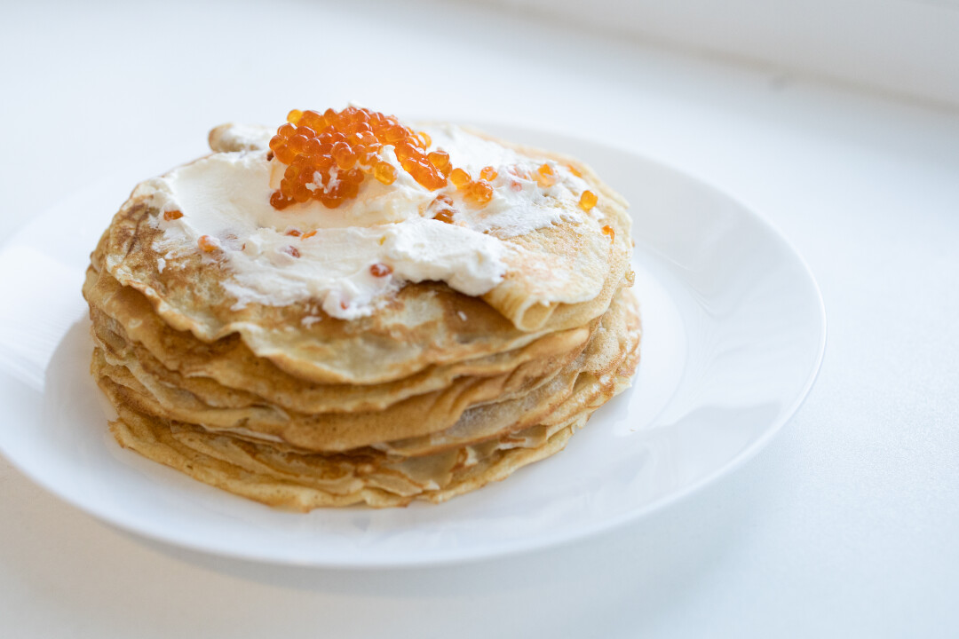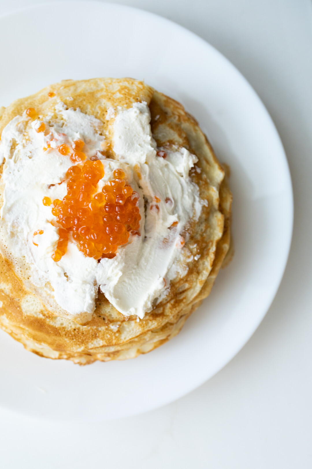 Для меню любимый прием пищи - это завтрак, а лучший завтрак - это блины! Я их обожаю, но по-настоящему волшебный старинный рецепт нашел только этим летом. Я пообщался со всеми бабушками-старушками и собрал идеальный рецепт настоящих русских блинчиков - тонких, румяных, сладких. Некоторые нюансы для меня самого стали удивительным открытием, например луковица в рецепте блинов. В качестве начинки я тоже приверженец русских традиций и начинку выбрал классическую – красную икру, немного разбавленную ее итальянским маскарпоне.