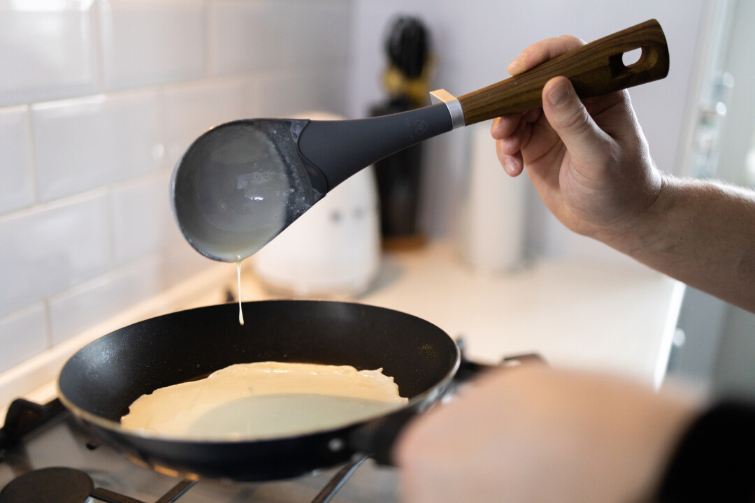 - Разогретую на среднем огне сковороду обмазать масляной луковицей для того, чтобы появился сладковатый аромат как из печки. Вылить половину половника теста от центра к краю, слегка поворачивая сковороду. Дать поджариться одной стороне, после того как края блина зарумянились, можно переворачивать и румянить вторую сторону.
