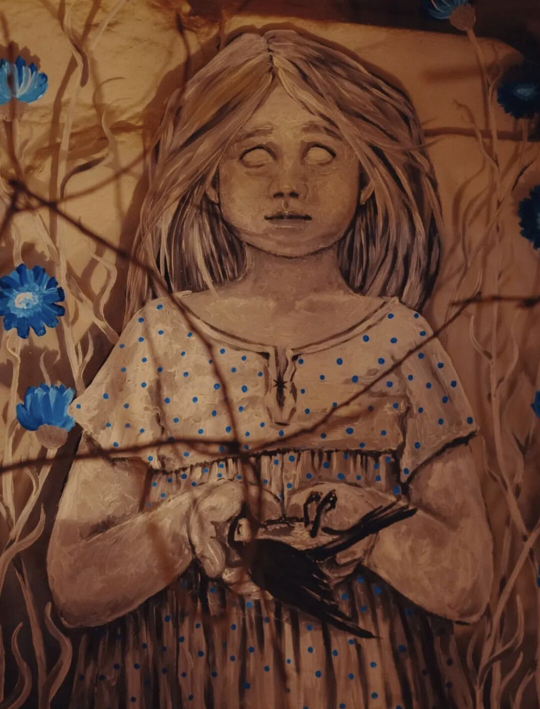 Я вообще люблю художниц. Недавно урвала страшную работу с девочкой и мёртвой синичкой на оконной раме Лены Лисицы, когда была на экскурсии в студии «Тихая». Хотя саму работу приметила ещё на открытии галереи «1221».