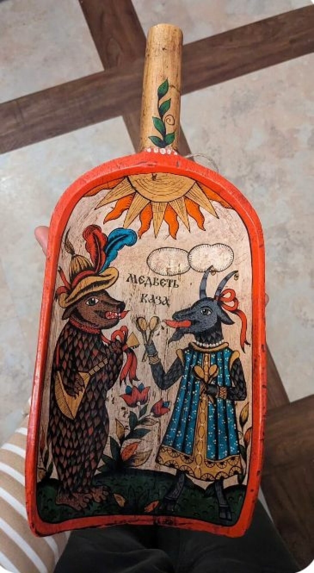 Я второй год покупаю на арт-мире работы из мастерской «Сто лет в обед». Они реставрируют старинные предметы деревенского быта, найденные в разных уголках страны. Они дают новую жизнь и новое прочтение таким вещицам, нанося на предметы уникальные художественные образы.