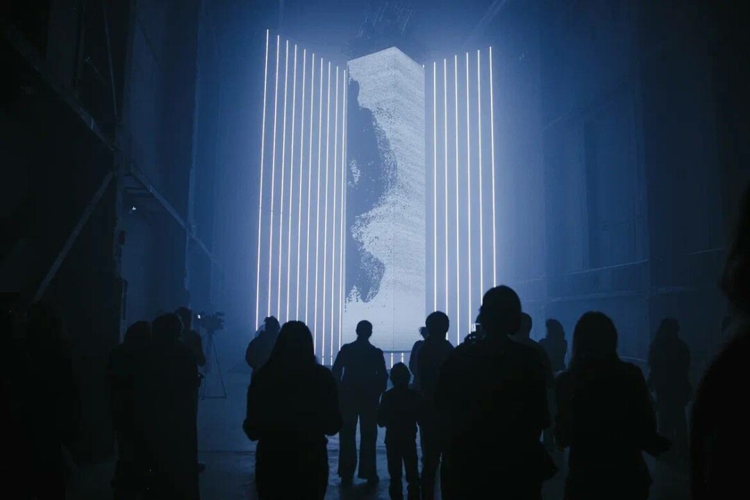 Memory Terminal – это два экспоната: гигантская стела из диодного экрана, парящая над водой, и руинированный бетонный монумент, две части которого соединены движущимися красными лучами. Монумент неподвижен, он застыл в моменте разрушения, фиксируя мгновение переходного состояния памяти. А стела, наоборот, будто бы живет собственной жизнью: сквозь нее то и дело проникают инфоволны и вспышки энергии, она загорается, озаряя все помещение своим ярким светом, чтобы затем вновь слиться с тьмой.