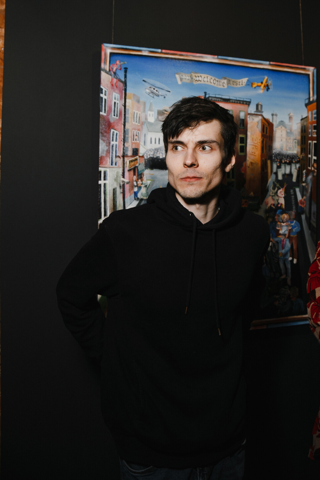 Evsti Bomse, художник: «Выставку «Электрические сны» можно считать открытием нового этапа на моем творческом пути. Из новшеств здесь композиционные решения: многосюжетность, большое количество персонажей. Я работаю сериями, в основном, часто использую образ противоположности. Вот, например, две картины: одна темная и мрачная, другая светлая. Что их связывает? На темной люди веселятся – это пир во время чумы, а на светлой издалека кажется, все беззаботно и жизнерадостно. Но, когда начинаешь всматриваться, видишь, что люди здесь страдают, находясь в хаосе, и яркие цвета – ширма и обман ожиданий. Все работы объединяет стремление показать человеческие пороки и воплощение человеческого зла. Например, на картине «Тупик» персонажи находятся на распутье. С одной стороны — духовная сила, с другой – физическая. Что влияет на наш выбор совершать или не совершать зло? Закон и религия подсказывают, как поступать в той или иной ситуации».