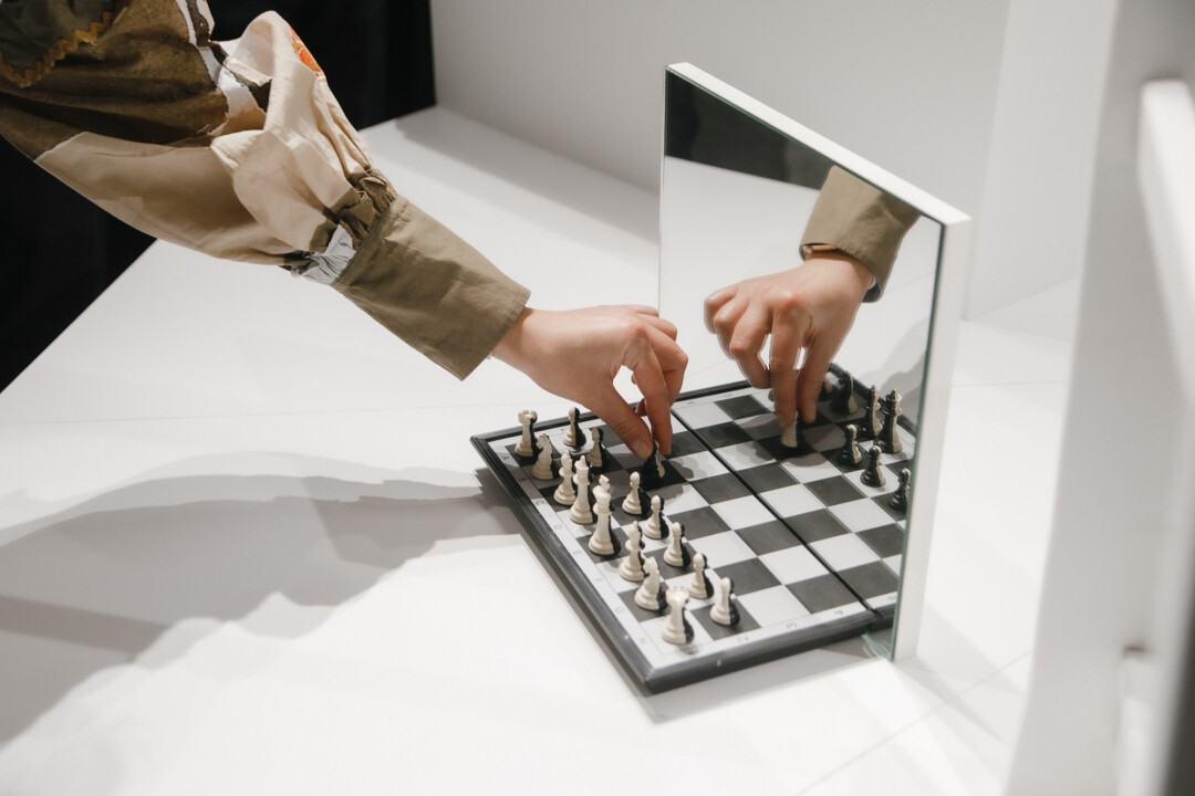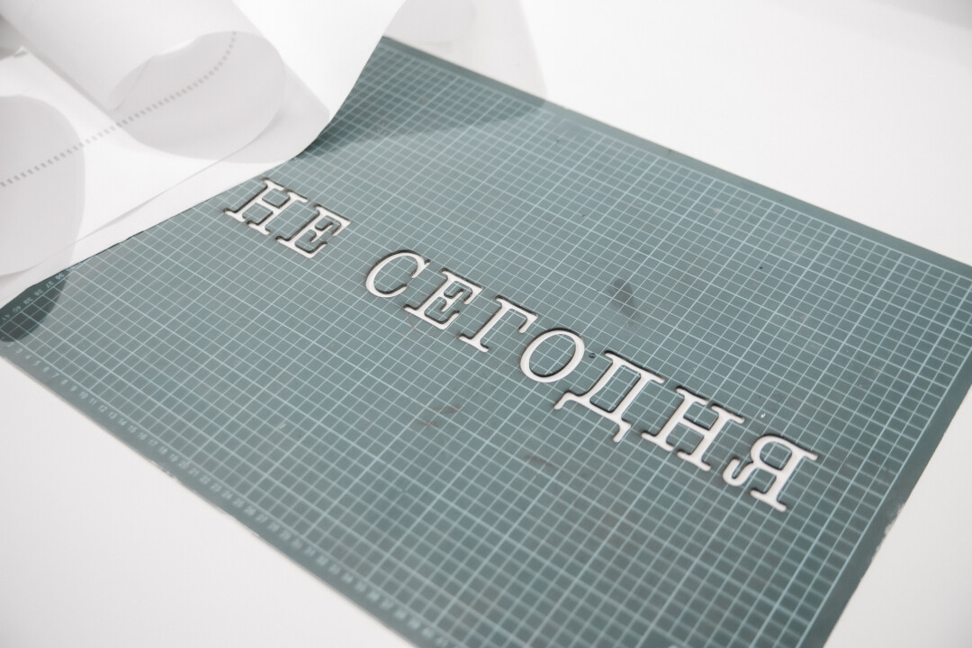 «Не сегодня» – реплика коврика из инсталляции Антона Морокова «Стол “Ежедневно”». Тут все самые важные рутинные предметы художника, многими из которых он пользовался сам: собственно сам коврик (предназначен для резки всего, что должно быть нарезано), печатная машинка, раздобытая другом на помойке, фонтанчик для кофе, который изначально был поилкой для любимого кота, и шахматы (у художника, как оказалось, по ним второй разряд!).