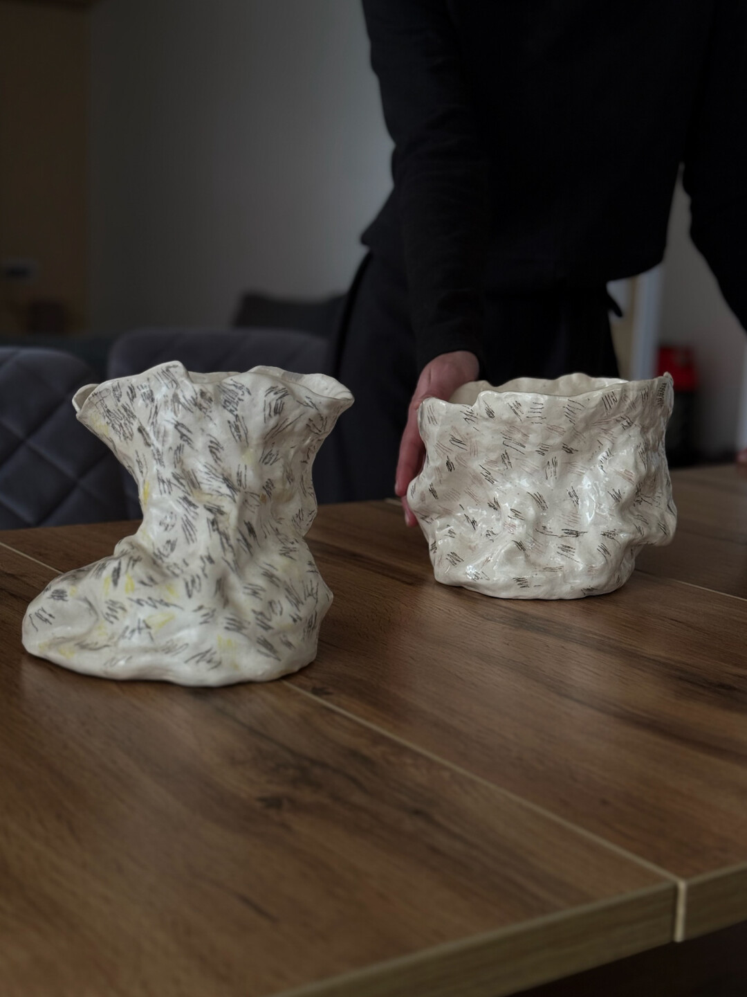 Керамика одновременно и предсказуема, и нет. Результат зависит от многих переменных, например, важна подача воздуха в печи, его температура, скорость сушки изделия. Даже вода, которую мы используем, чтобы растворять глину, тоже влияет. Если соблюдать все тонкости процесса, избегать технологических ошибок, то конечный результат прогнозируем. Но мы, художники, часто пренебрегаем некоторыми показателями – сознательно! – чтобы удивить зрителя (и себя) необычным эффектом. Ты ставишь изделие в печь, в голове есть план, что должно получиться. А выходит все еще лучше, чем задумывалось! Случайность – по моему мнению, муза керамики.