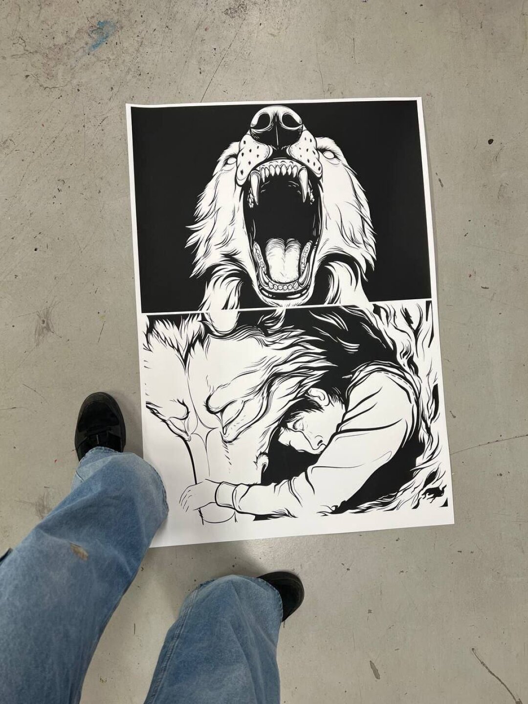Поля рассказывает историю о человеке в депрессии, переживающем звероподобные метаморфозы. Зверь – метафора саморазрушения, в котором персонаж оказывается запертым. В экспозиции – принты, отпечатанные лимитированным тиражом.