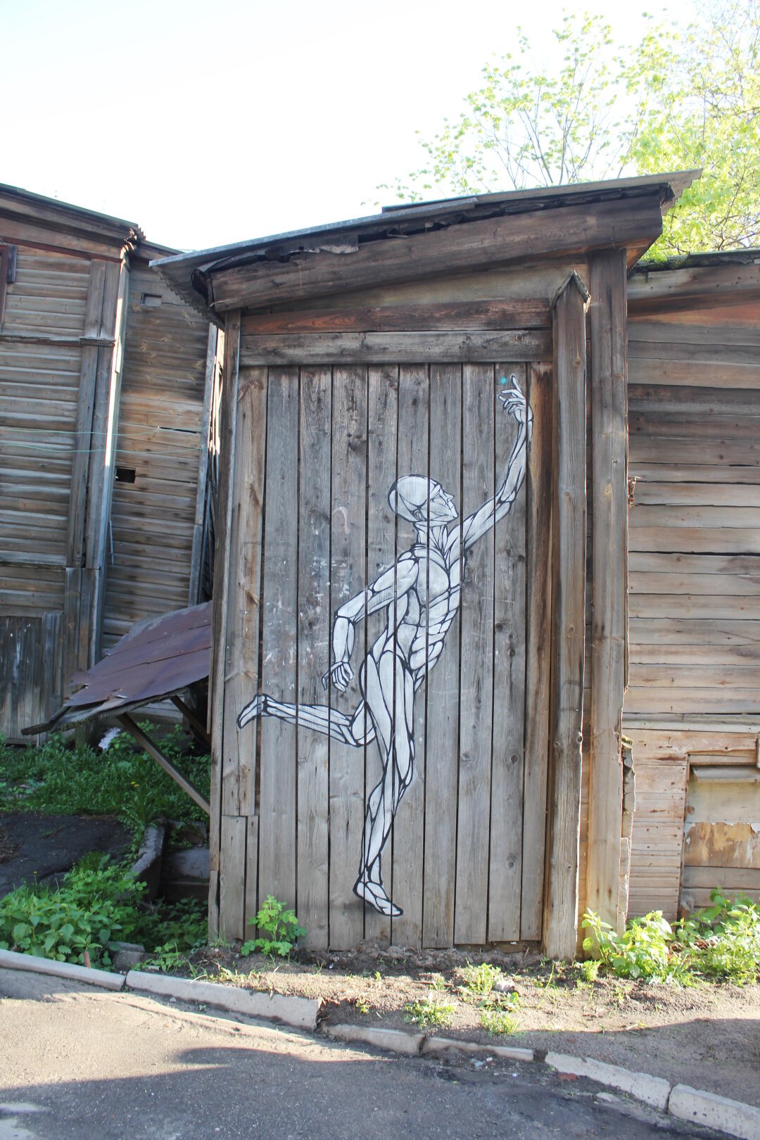 Фигуру ловца можно отыскать на обратной стороне ветхого дома на Ковалихинской. Эта работа часть выставочного проекта «Точки», организованного в одном из дворов в центре Нижнего, превратившего его в импровизированную галерею: