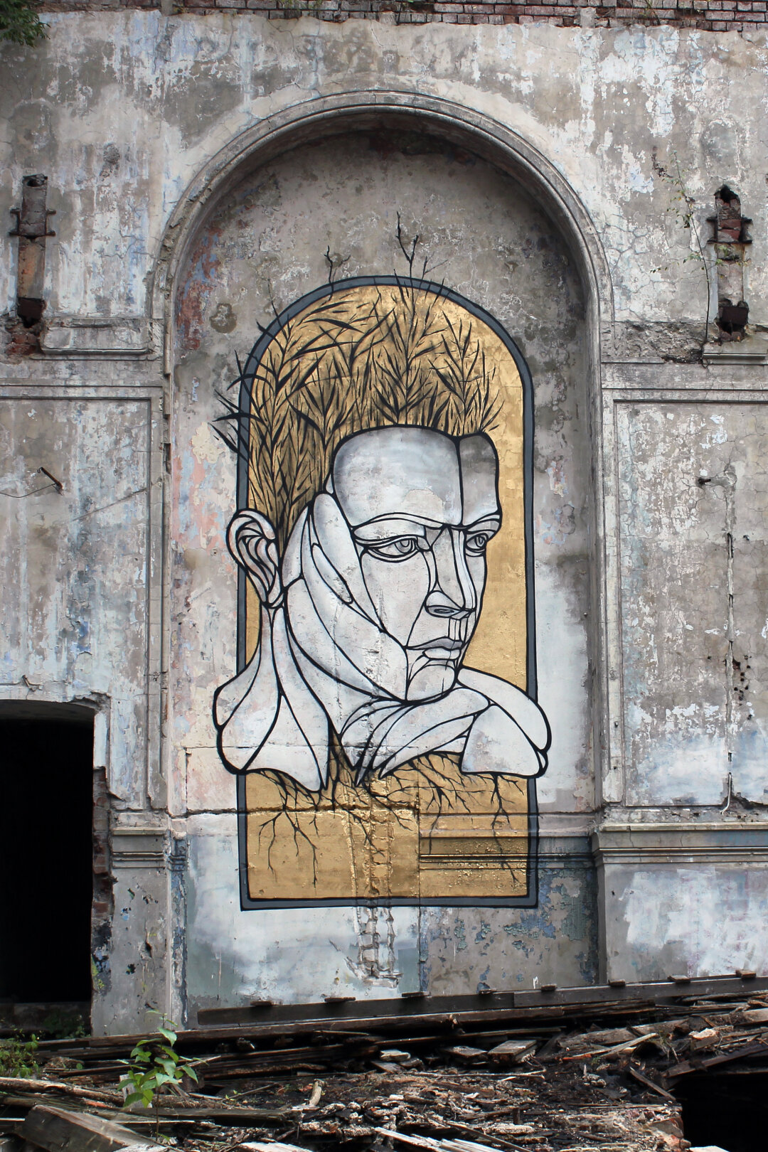 Еще одна работа из цикла «Части целого» расположена в арочном своде руин Куйбышевской водонапорной станции на Черниговской. Она была создана специально для альманаха «Части стен 2» – масштабного исследования российского уличного искусства: