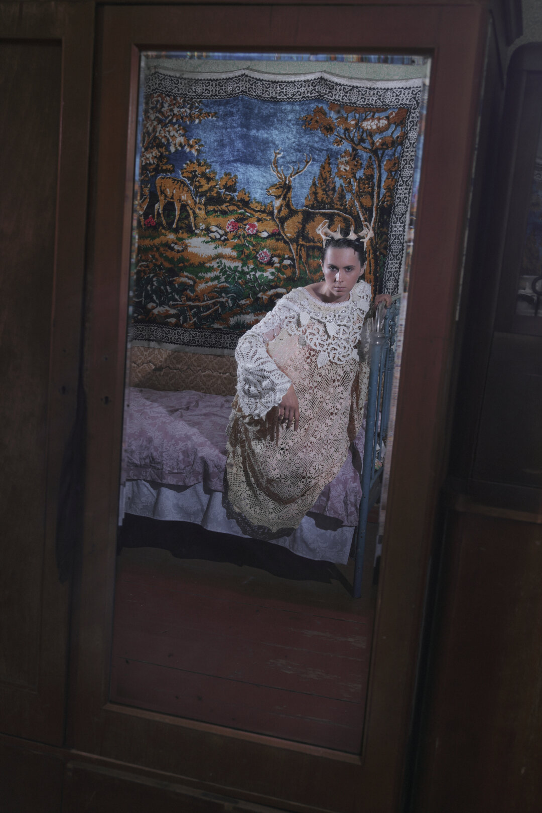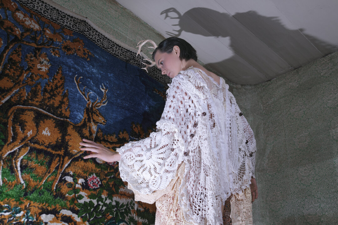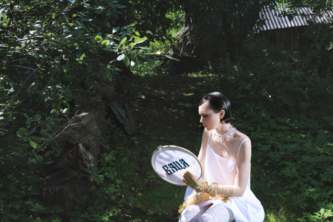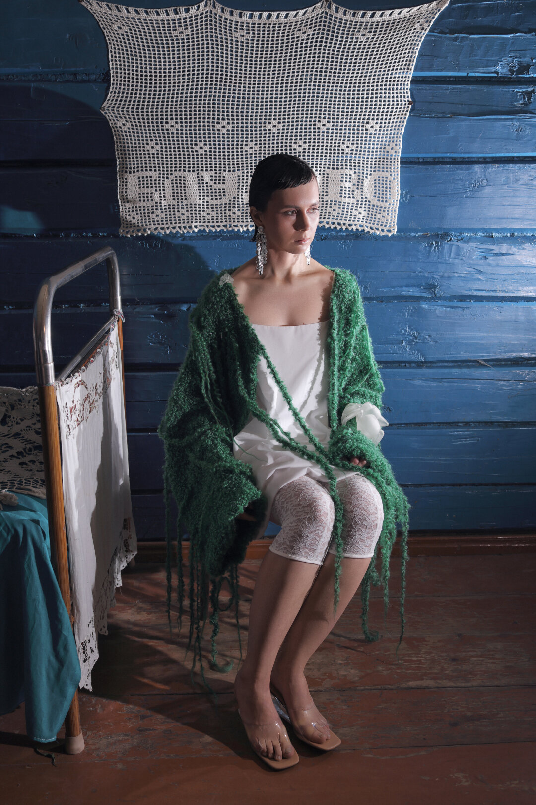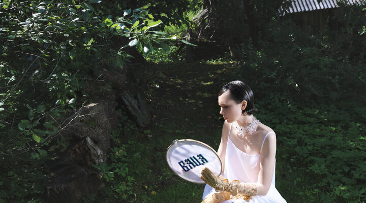 Возвращаем работы Вацы в аутентичный ландшафт, из которого они возникли. Натура – антуражный дом, словно из детских воспоминаний о каникулах у бабушки. Аутфит – концептуальный мэтч работ самой художницы и авторской одежды Vereja дизайнера Игоря Андреева. Безыскусный деревенский уют настолько поглощает героиню, что она сама будто становится частью вышивок и узоров.