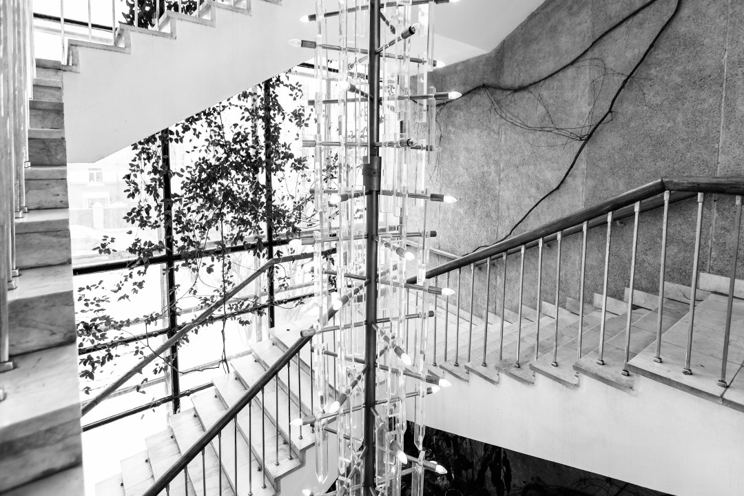 Дом создавался как площадка для связи архитекторов с жителями города. В этой локации представитель андеграундной культуры, русско-немецкий художник и музыкант Станислав Глазов создаст лазерную инсталляцию: преломление лучей сквозь уже готовый материал – модернистскую люстру, проходящую сквозь три этажа. Глазов занимается исследованиями и разработками в сфере мультимедиа технологий уже более двадцати лет, является основателем медиастудии Licht.Pfad и известен своей преподавательской деятельностью по TouchDesigner и Houdini.