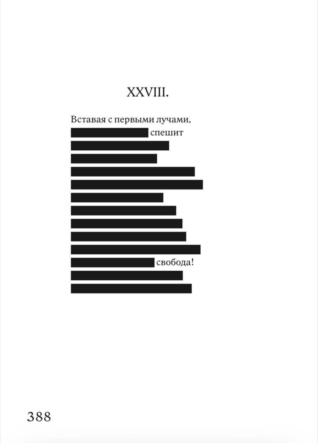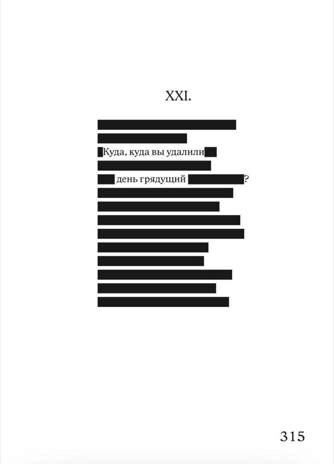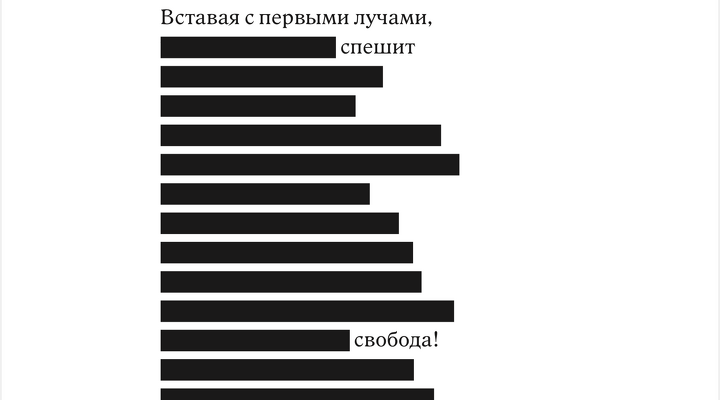 Наличие черного закрытия в книге было исходным условием. Был еще вариант сделать затемнения полупрозрачными, чтобы можно было заглядывать за запрет и читать Пушкина в оригинале, но в этом случае читатель получает слишком много свободы, которая сегодня может быть опасной. Так что для блага самих же читателей блэкаут строго черный, классический.