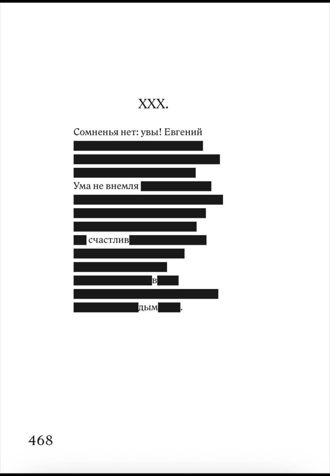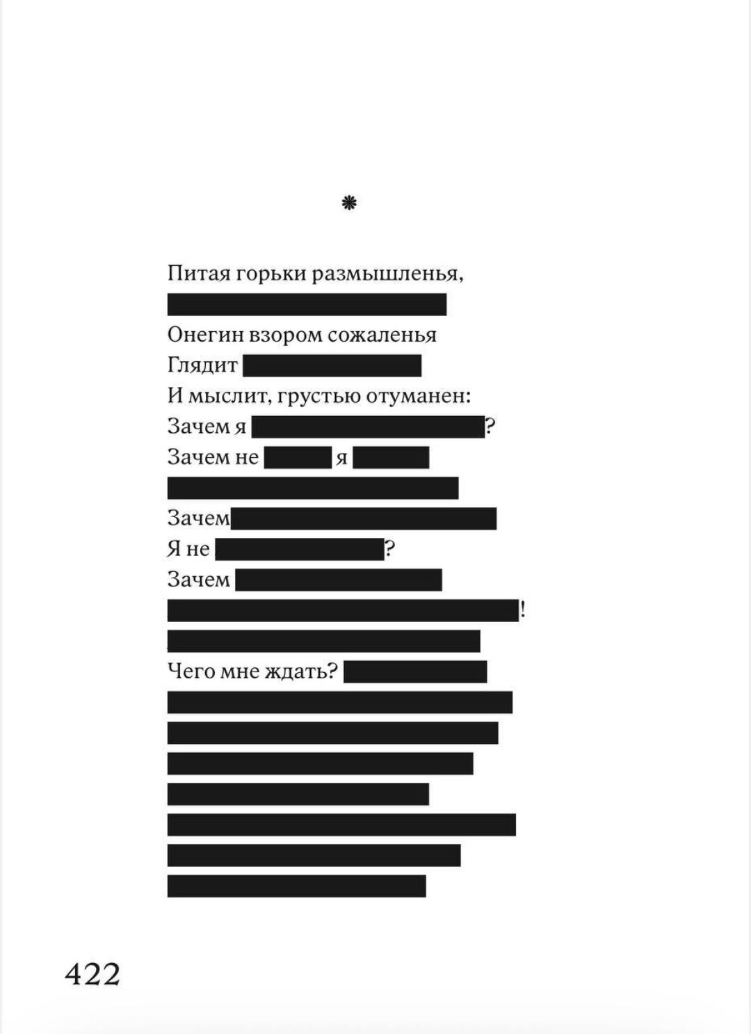 У меня, кажется, здесь было две роли. Роль поэта – сочинение из вычитания, добавление образов времени, нахождение формулировок, подходящих к XXI веку, вырубка мемов и пр. И роль соавтора, которая тут также важна. Соавторства не может не быть в блэкауте. В случае с «Онегиным» (как и любым другим текстом из истории литературы) было невозможно не замечать коренного создателя, его языка, идей и прочей созданной начинки текста. Это же не геодезический сборник. Здесь сияло «солнце русской поэзии». Как соавтору мне было важно вытащить на свет, спрятанные из-за тогдашней царской цензуры и из-за пушкинской самоцензуры, куски и строки, которые обычно не печатались в «Евгении Онегине». А с другой стороны, в тексте много пушкинской прямой речи и выражения позиции, которая мной смыслово трансформировалась, оставаясь при этом структурно пушкинской. Соавторства было не избежать.