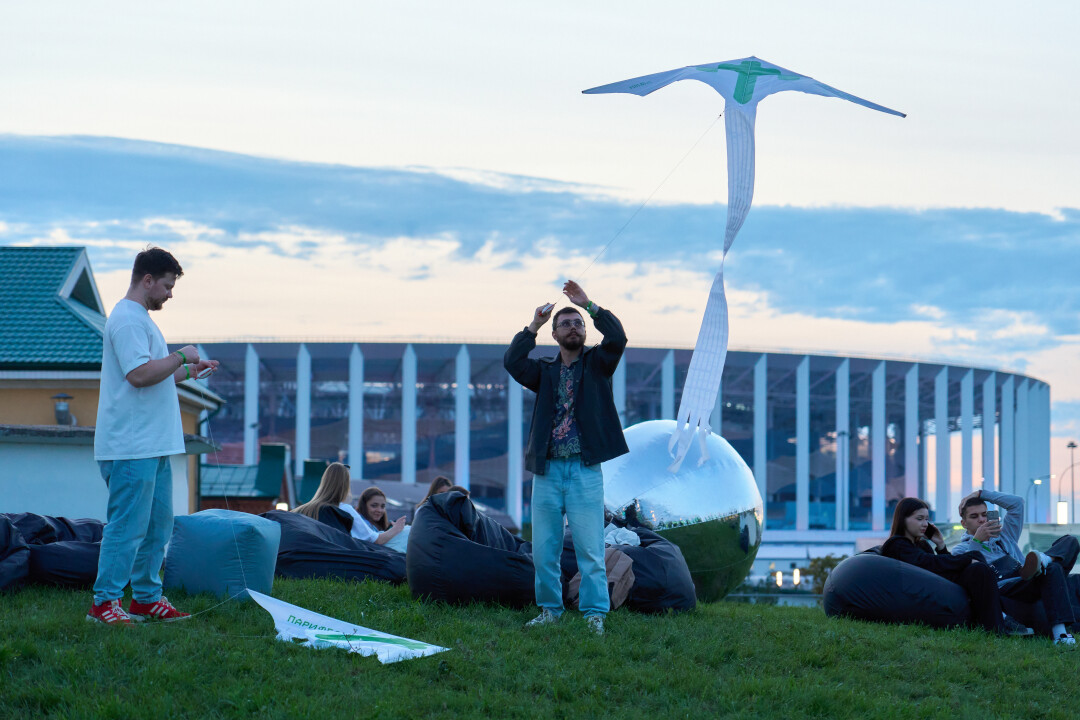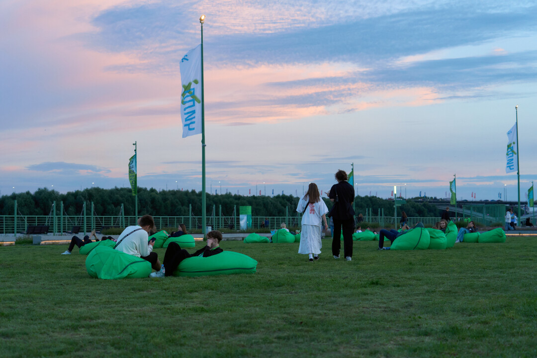 Пройдя два километра вдоль стадиона, доходим до Стрелки и начинаем осматривать наши владения на следующие несколько часов: на мейне диджей греет толпу, состоящую из молодой пары с танцующим не в такт ребенком, а на электронной сцене разминаются танцоры (там пройдут соревнования по брейкингу). По соседству в пуфиках растекаются тусовщики, копящие силы на вечер, а рядом ЗОЖ-маньяки постигают основы джампинга (групповая кардиотренировка на специальном батуте. – Прим. Редакции)