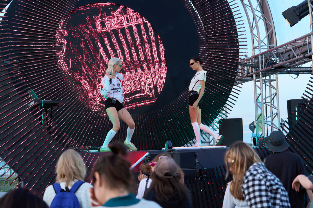Электронная сцена после заката своей музыкальной селекцией и аудиторией похожа на московские новомодные клубы. В лайнапе только актуальный звук: THE DAWLESS, LAVBLAST, Biicla, Polovinka и наша «Станция метро Горьковская», а толпа пестрит в мерче техно-панков Locked Club и лейбла System 108.