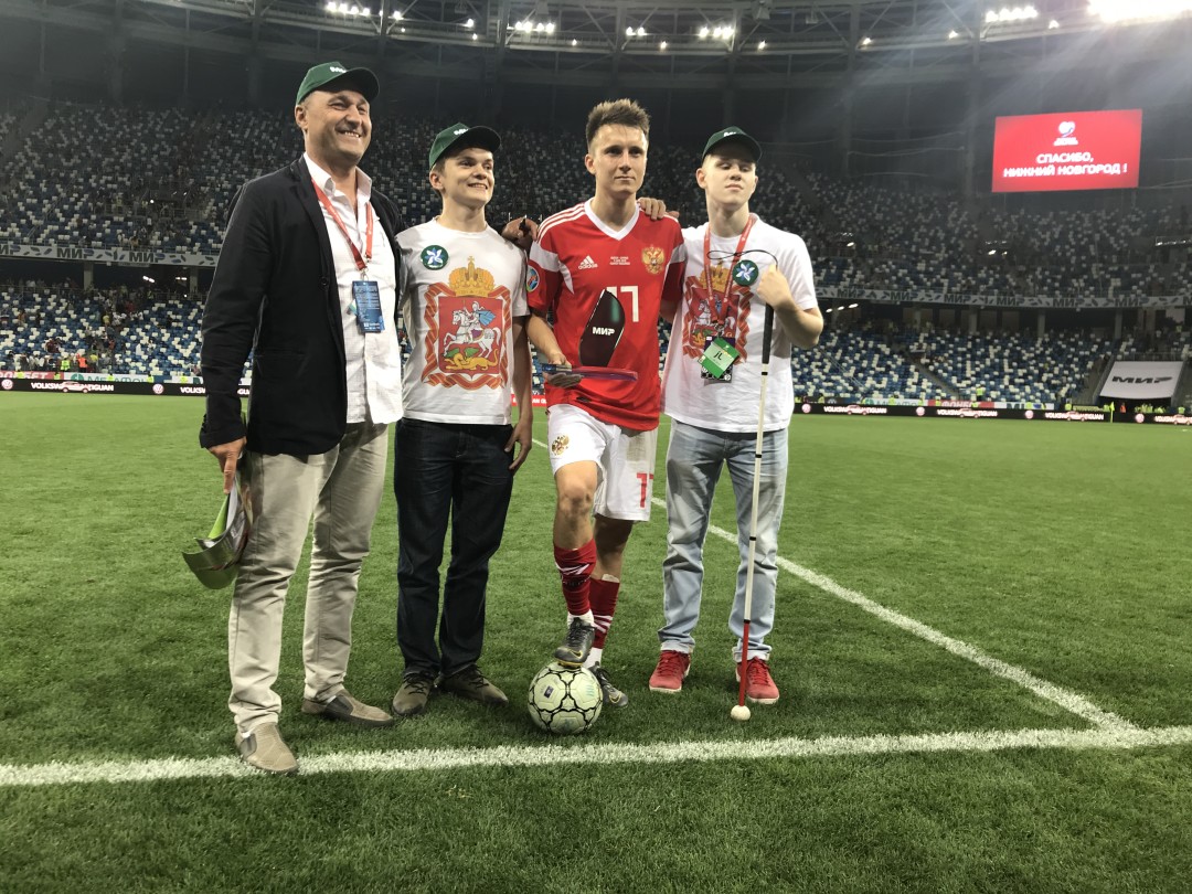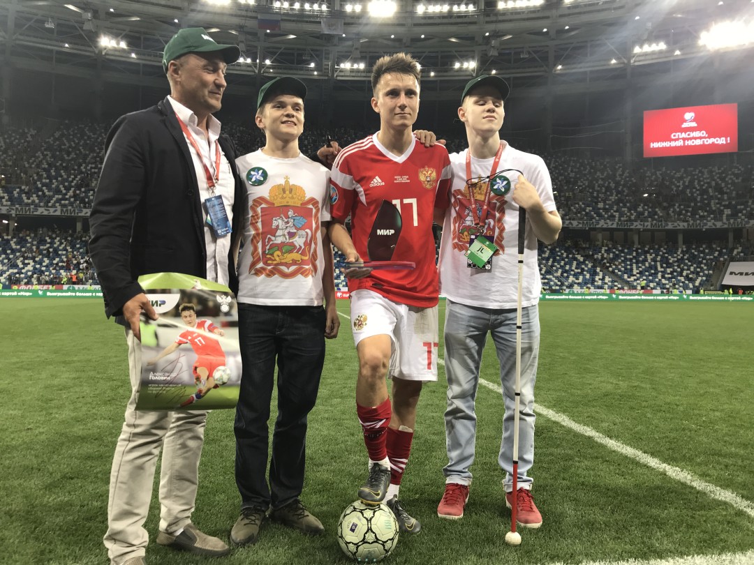 На матче в Нижнем Новгороде лучшим игроком был признан Александр Головин. Приз от платежной системы «Мир» ему вручили игроки сборной России по футболу слепых Илья Федоров и Андрей Демин.