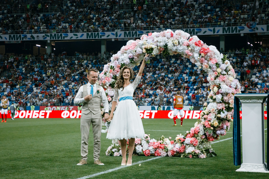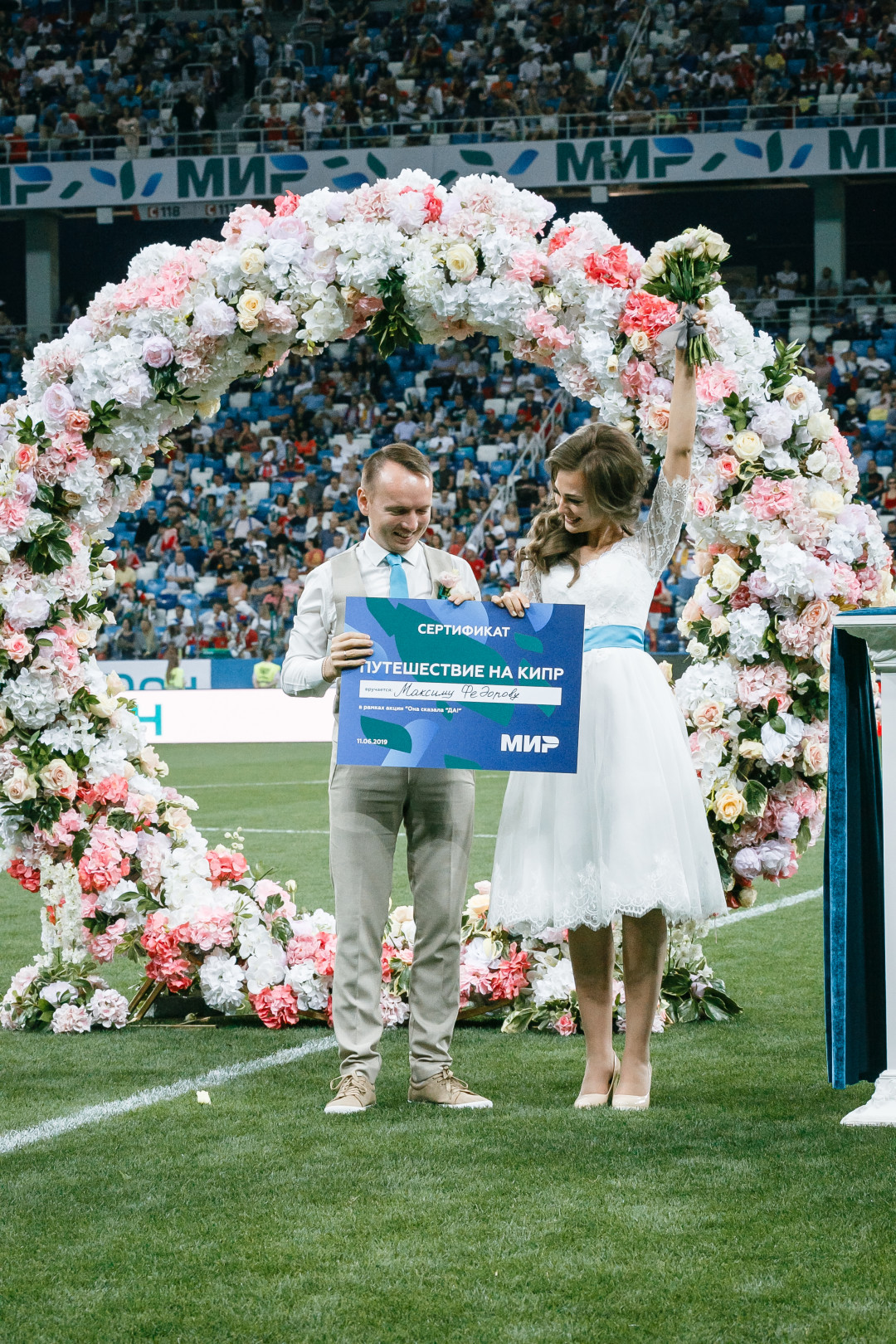В перерыве матча Россия-Кипр в Нижнем Новгороде состоялась свадебная церемония. На глазах у тысяч болельщиков вступили в брак победители конкурса в соцсетях, проводимого РФС и ПС «Мир».