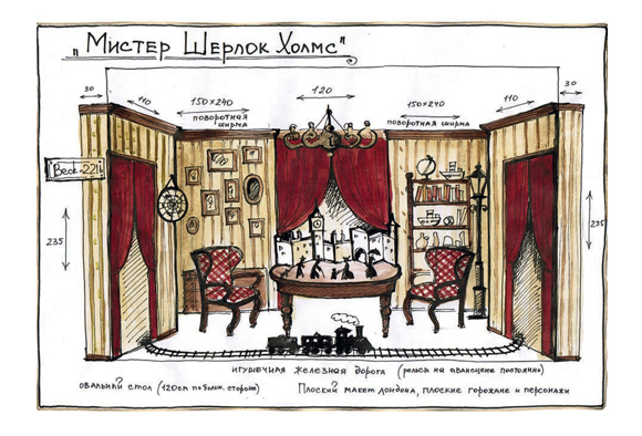 домовладелица миссис Хадсон (Ольга Гапоненко) — на этот раз юная и очаровательная особа,— заодно выступят в роли кукловодов и при помощи силуэтных фигур, которые будут извлекаться прямо из викторианского интерьера комнаты, разыграют для зрителей сюжеты «Этюда в багровых тонах» и «Знака четырех». «Мистер Шерлок Холмс» — второй спектакль Васильева в театре «За Черной речкой». «Русалочку» адресовали малышам, а на историю сыщика приглашают и детей, и взрослых. Кроме кукольного обличья Холмс предстанет в человечес-ком: в виде самого Петра Васильева. В спектакле силуэтные фигурки с картин оживут.  Художник Алевтина Торик, оформляющая спектакль, — лауреат мыслимых и немыслимых театральных премий: «Золотая маска», «Золотой софит», «Золотой дельфин» и так далее.