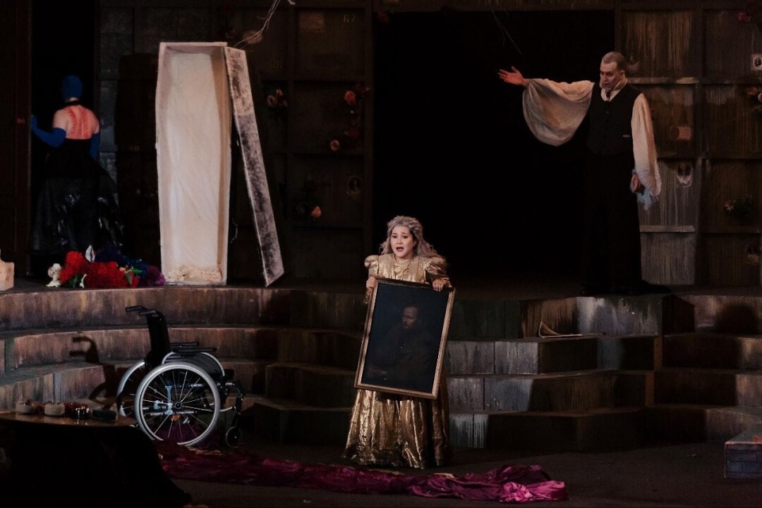 Ну все, допрыгались! На сцену вышли Истина, Красота, Наслаждение, Время и Разочарование. Главная героиня оперы «Триумф Времени и Разочарования» Генделя в постановке Елизаветы Мороз – Красота, которой Время назойливо напоминает о себе то с экрана телевизора, то прямо с шахматной доски. Разочарование, разумеется, ходит с портретом Достоевского. А что творит Наслаждение, стыдно даже пересказать. Лучше один раз увидеть.